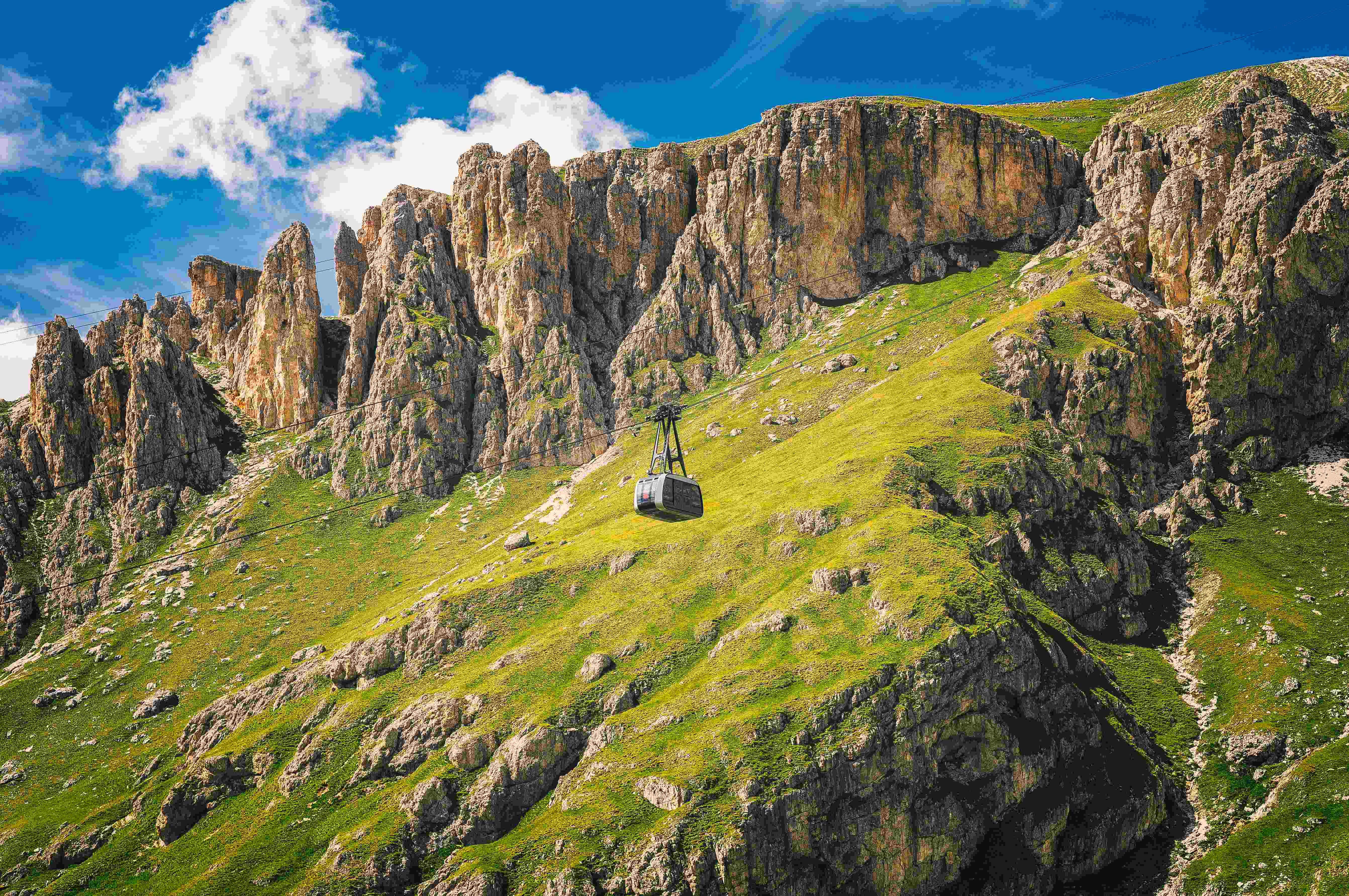 搭乘被譽為多洛米堤空中巴士的高速纜車,從海拔2,239公尺的波多伊山口,僅3-4分鐘的時間,體驗垂直攀升的震撼感,上升至海拔2,950公尺的山頂高處。在上升的過程中,可以從不同角度欣賞到波爾多伊山口、下方蜿蜒的公路,以及周圍壯麗的馬爾莫拉達山峰。