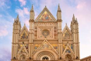大教堂坐落在火山塞上的奧爾維耶托鎮,其立面是一座經典的宗教建築,包含 14 世紀至 20 世紀的設計元素,包括大玫瑰窗、金色馬賽克和三扇門。巨大的青銅門,裡面有兩座壁畫小教堂,由當時最好的意大利畫家裝飾,上面有審判日的圖像。