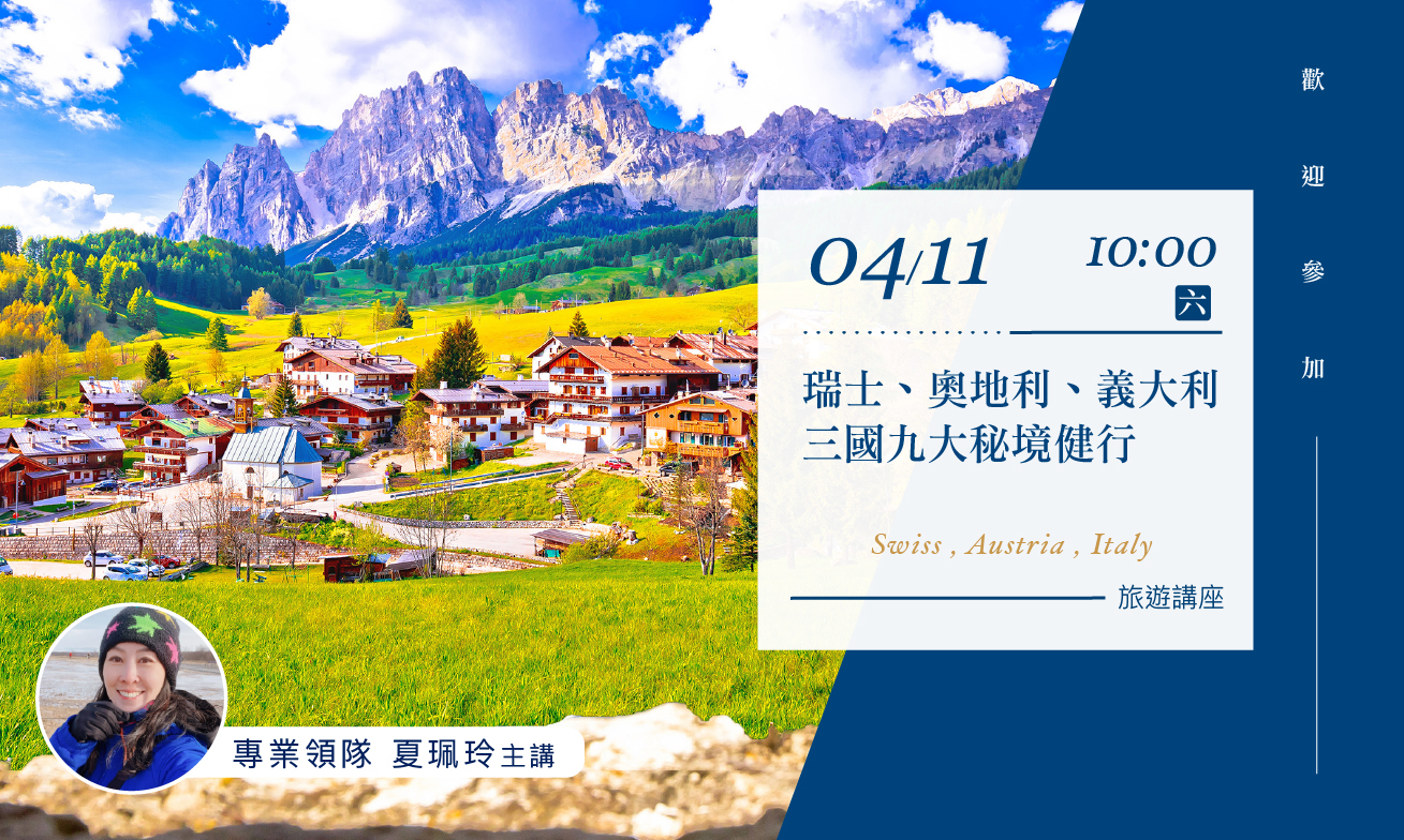04/11(六)10:00【瑞士、奧地利、義大利三國九大秘境健行】旅遊講座(台北場)