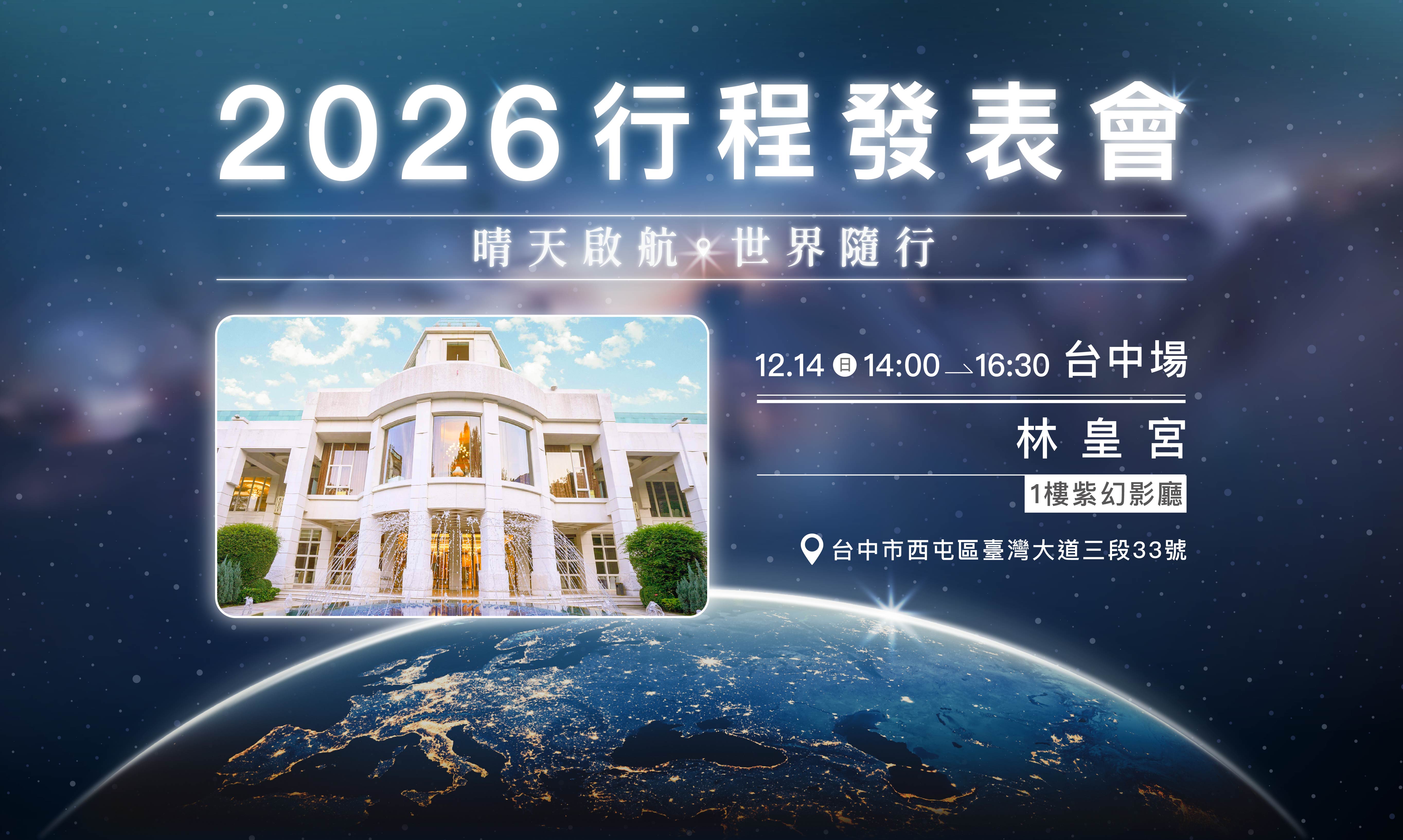 12/14(日)14:00【2026年度發表會:晴天啟航,世界隨行】旅遊講座(台中場)(林皇宮1F紫幻影廳)