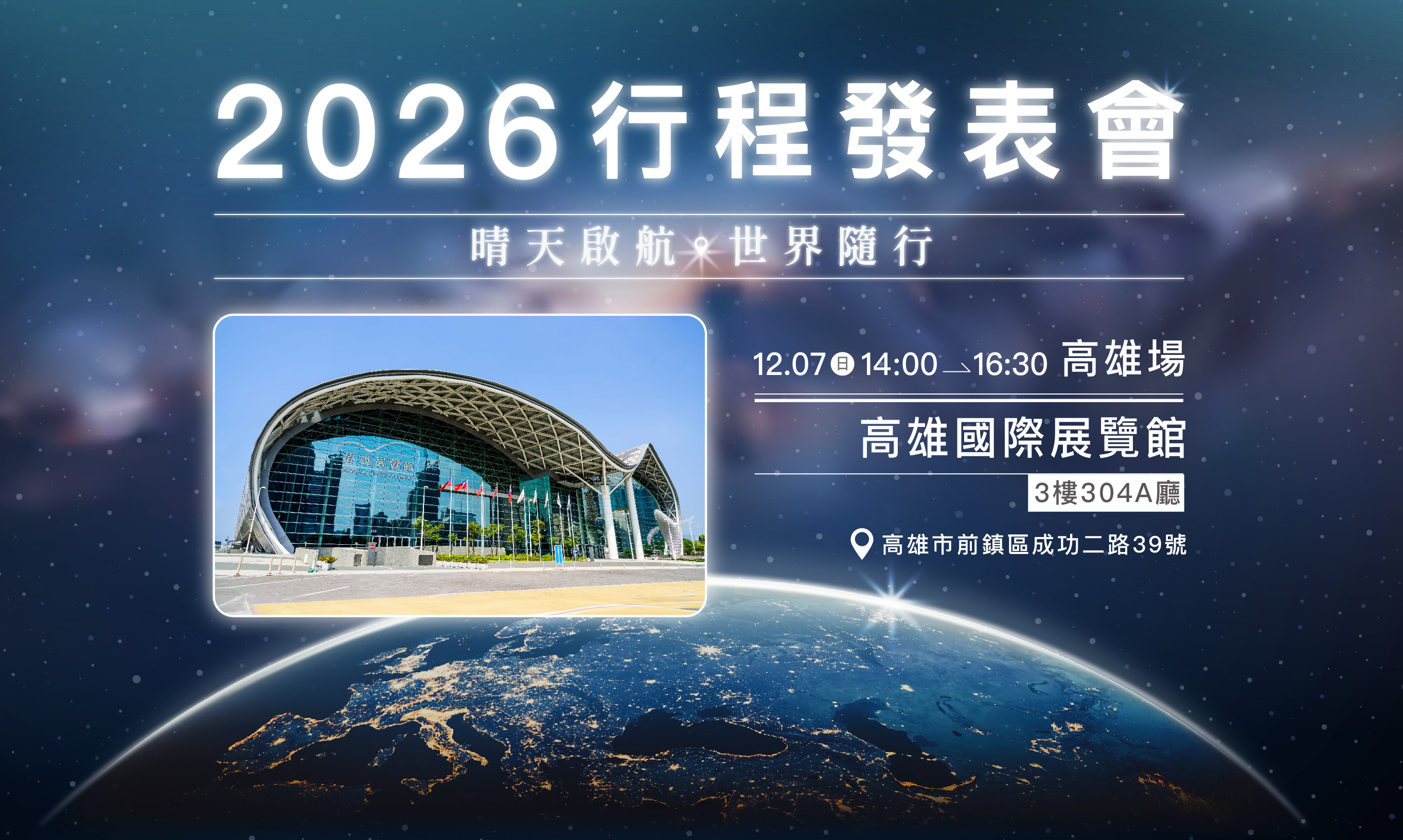 12/07(日)14:00【2026年度發表會:晴天啟航,世界隨行】旅遊講座(高雄場)(高雄國際展覽館3F.304A廳)