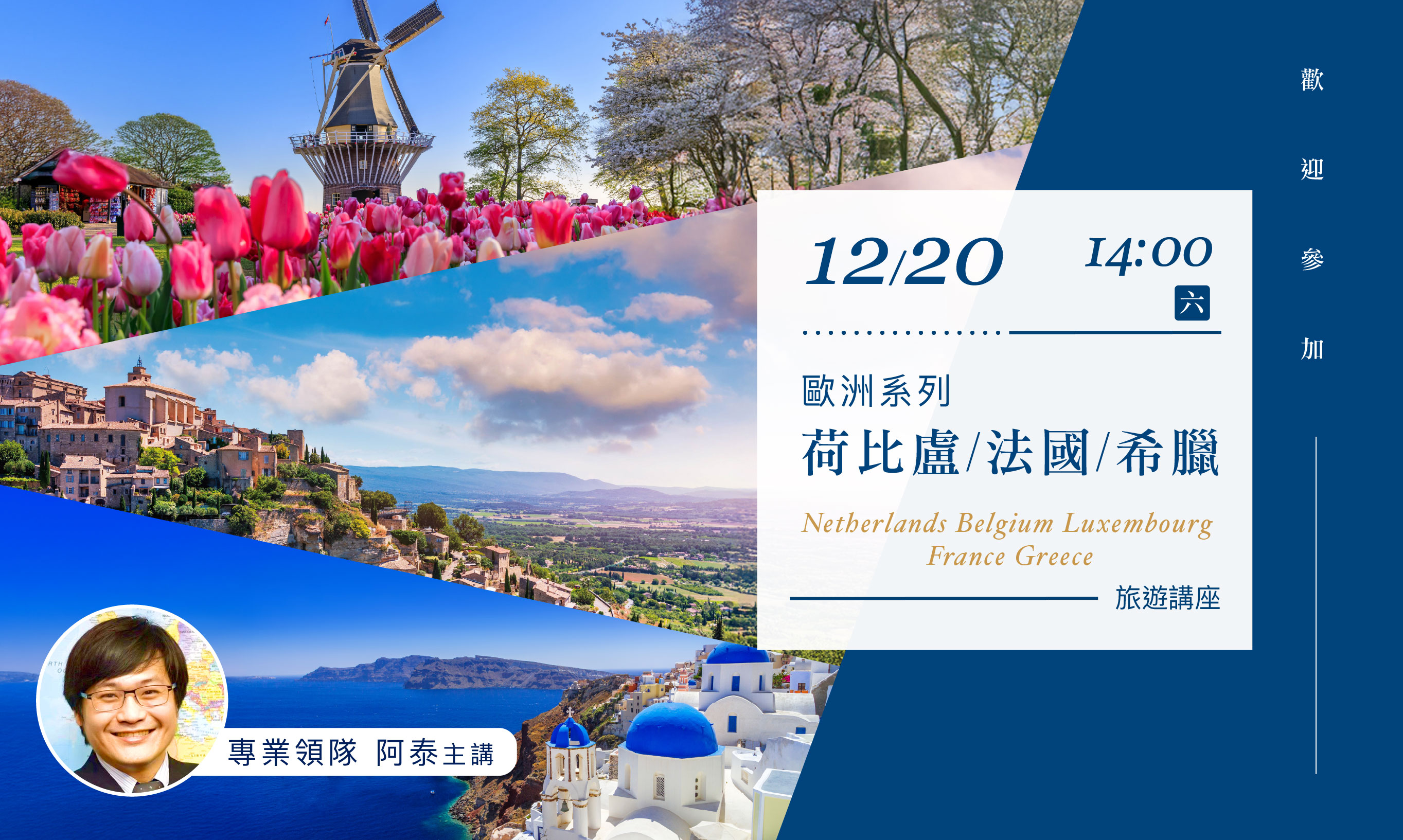 12/20(六)14:00【歐洲系列 講座荷比盧/法國/希臘】旅遊講座(SOGO百貨高雄店 8F活動區)※ 本場講座暫時額滿,報名請洽專員。