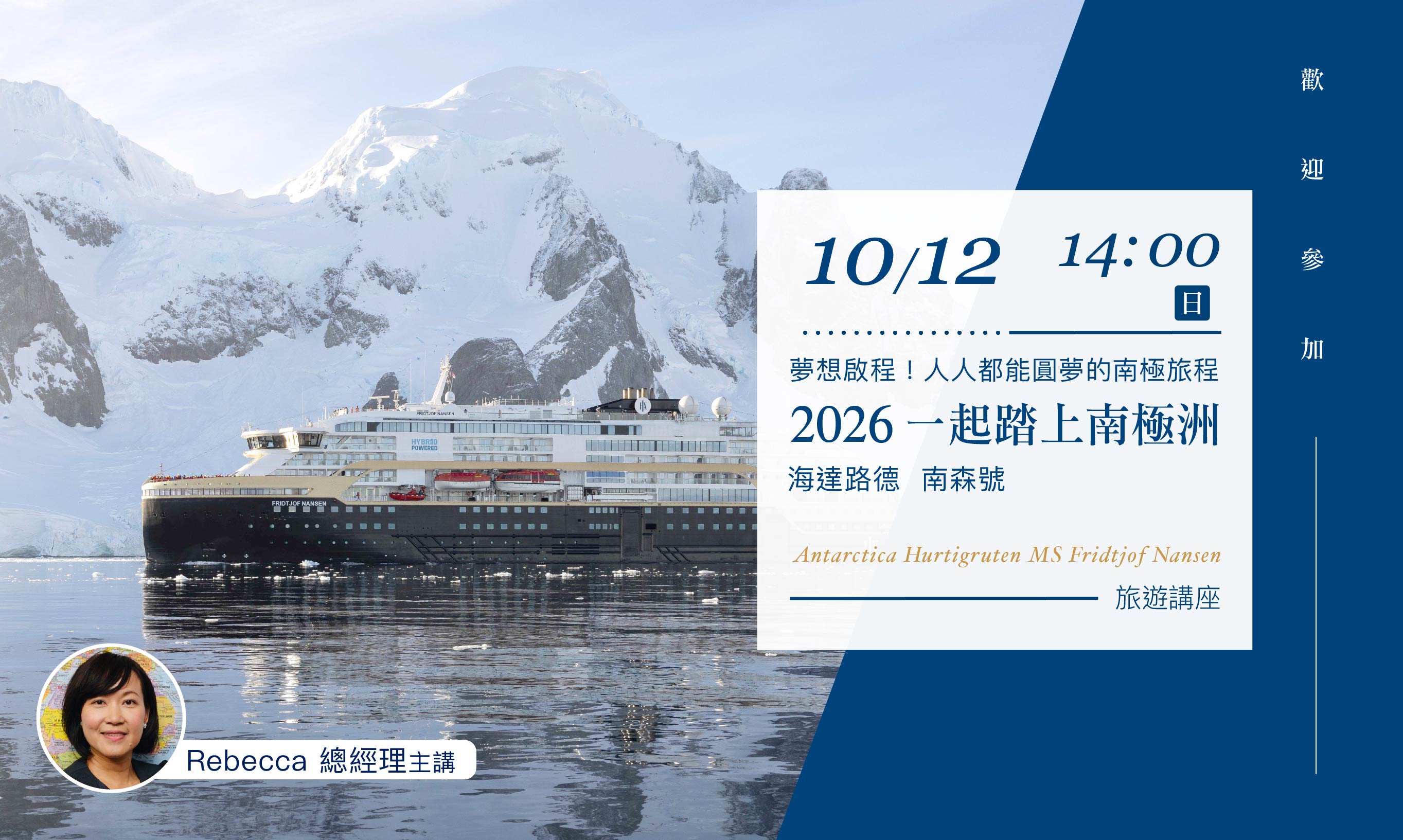 10/12(日)14:00【夢想啟程 人人都能圓夢的南極旅程 2026ㄧ起踏上南極洲:海達路德-南森號】旅遊講座(台南場)