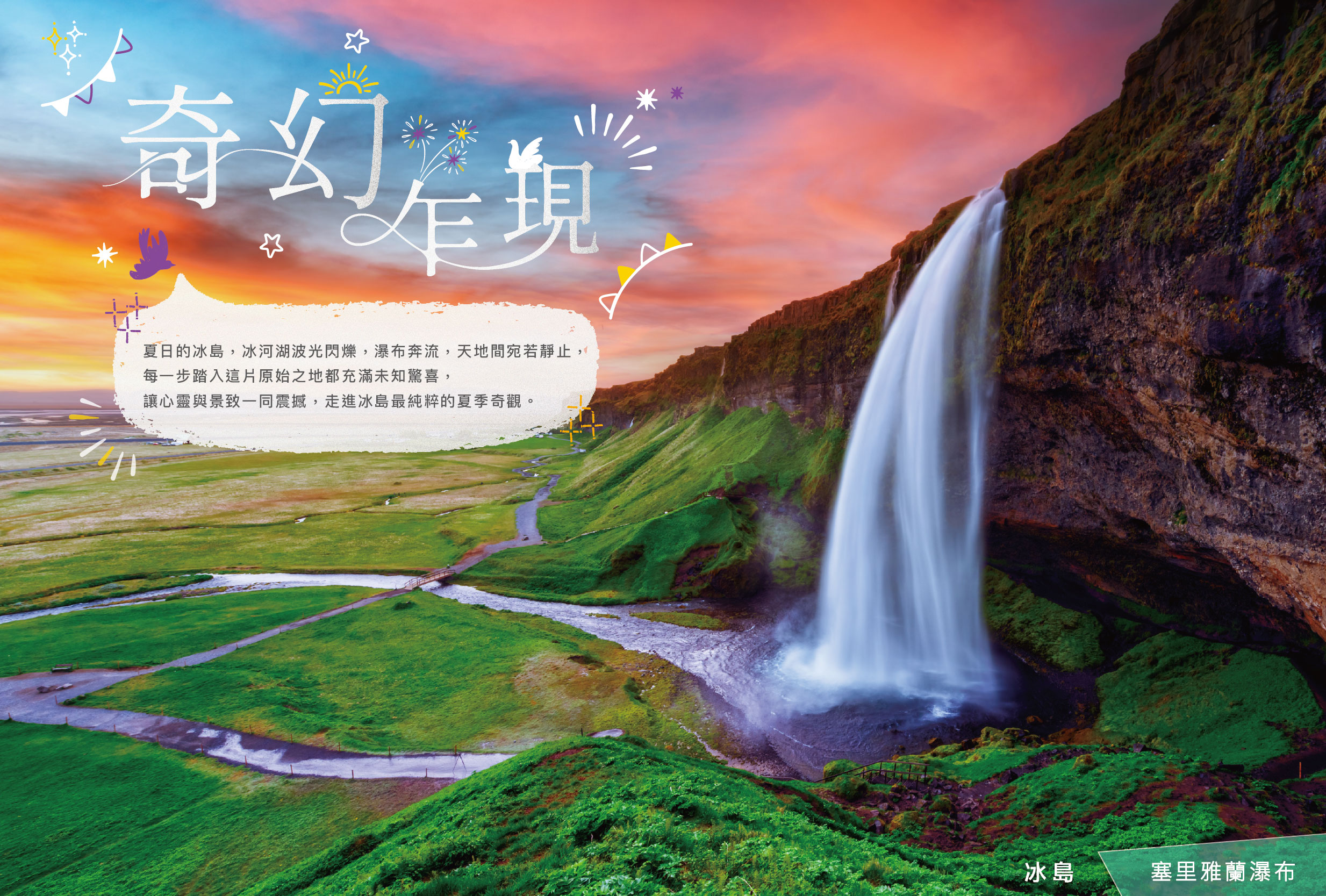 與歐洲大陸相隔著一片大西洋,遺世獨立的位置,冰島是大自然珍貴的獻禮。自然景觀豐富純淨,沒有商業化的過度包裝,是這份自然珍寶現身的最佳舞台。在冰島,您可以在大自然溫柔的懷抱下,找回心中最原始的那份感動。(圖:黛堤瀑布)