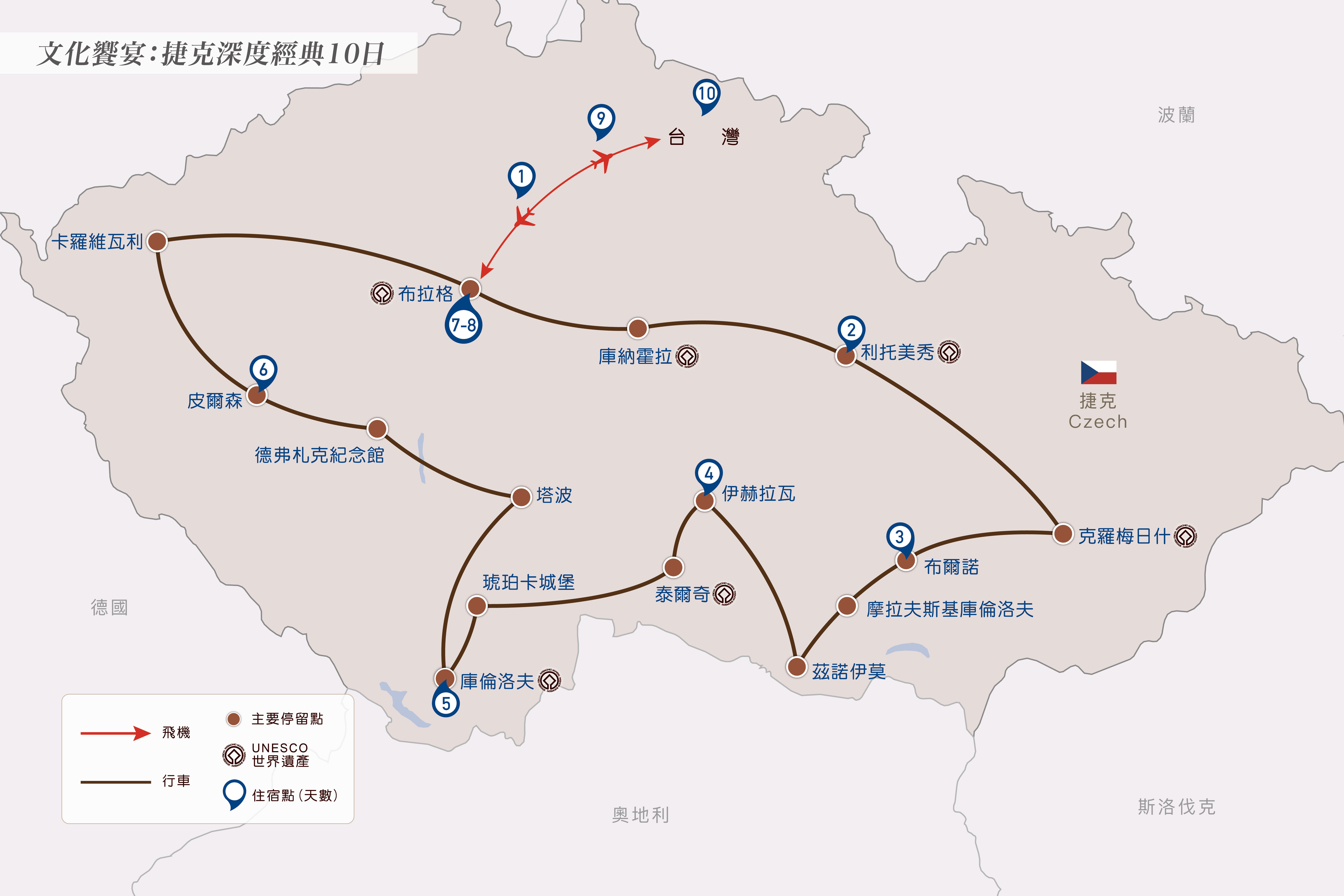 今日於桃園機場集合,搭乘豪華客機直飛前往捷克首都布拉格。班機於隔日上午抵達。