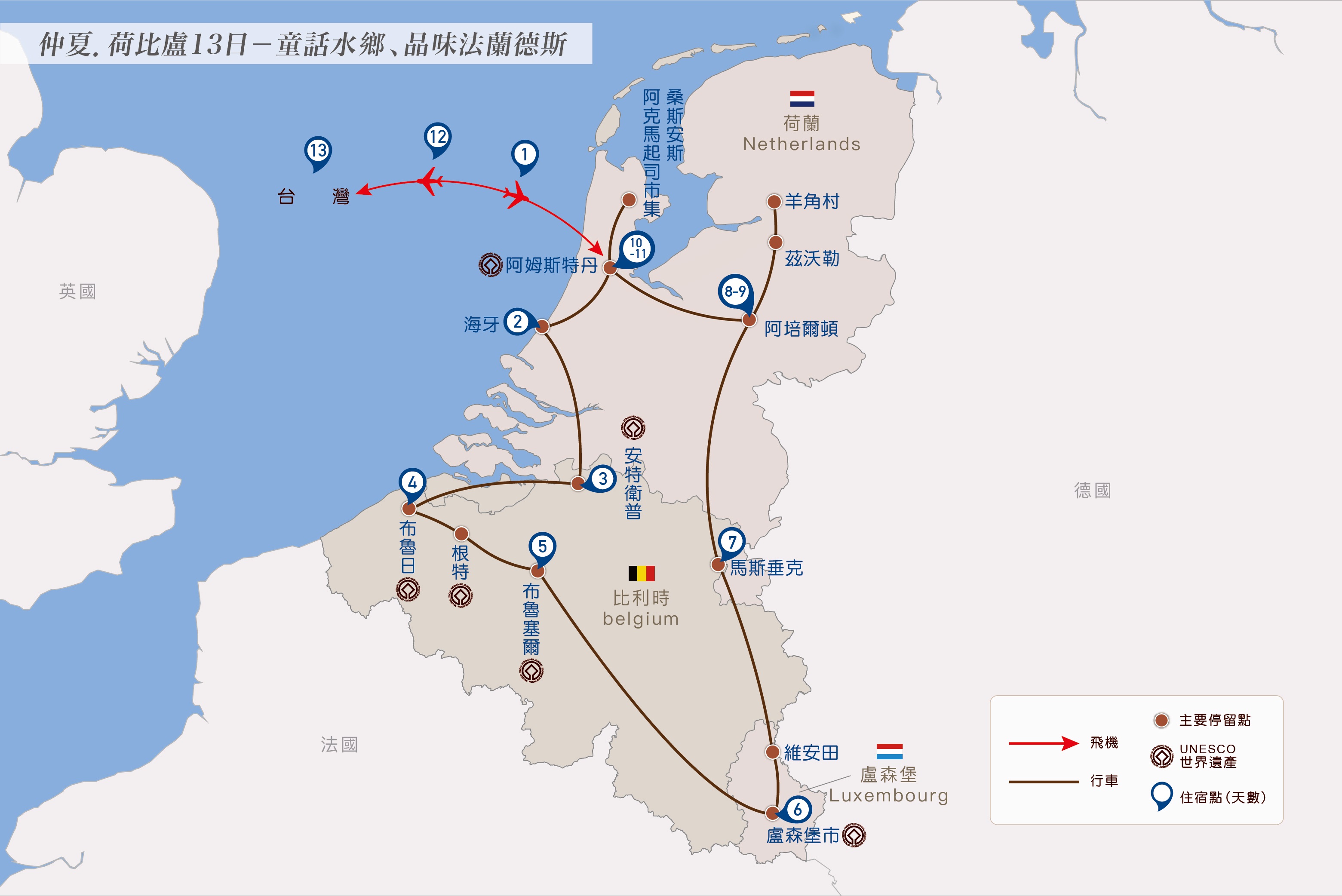 我們搭乘的荷蘭航空,除了台北舒適直飛之外(中途不停曼谷),早抵晚回的最佳時間安排,在大多旅遊歐洲的旅客已紛紛搭機在回程的路途中,您仍好整以暇的在逛街、購物,擁有最充裕完整的參觀時間。
