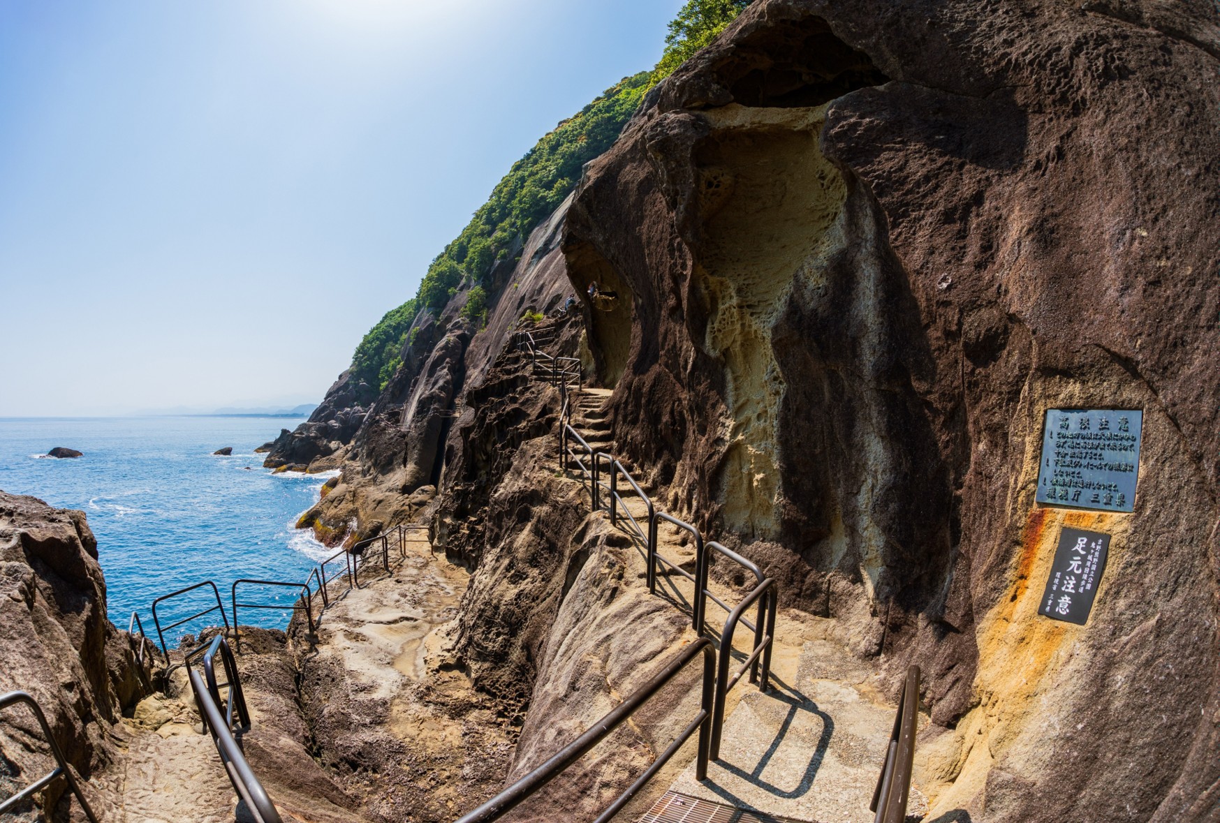 熊野古道朝聖路上最適合短途健行的路線。從山谷底部延伸到熊野那智大社、青岸渡寺和那智瀑布的鵝卵石階梯斜坡,兩旁長滿了有著數百年歷史的日本雪松、柏樹、樟樹和竹林。