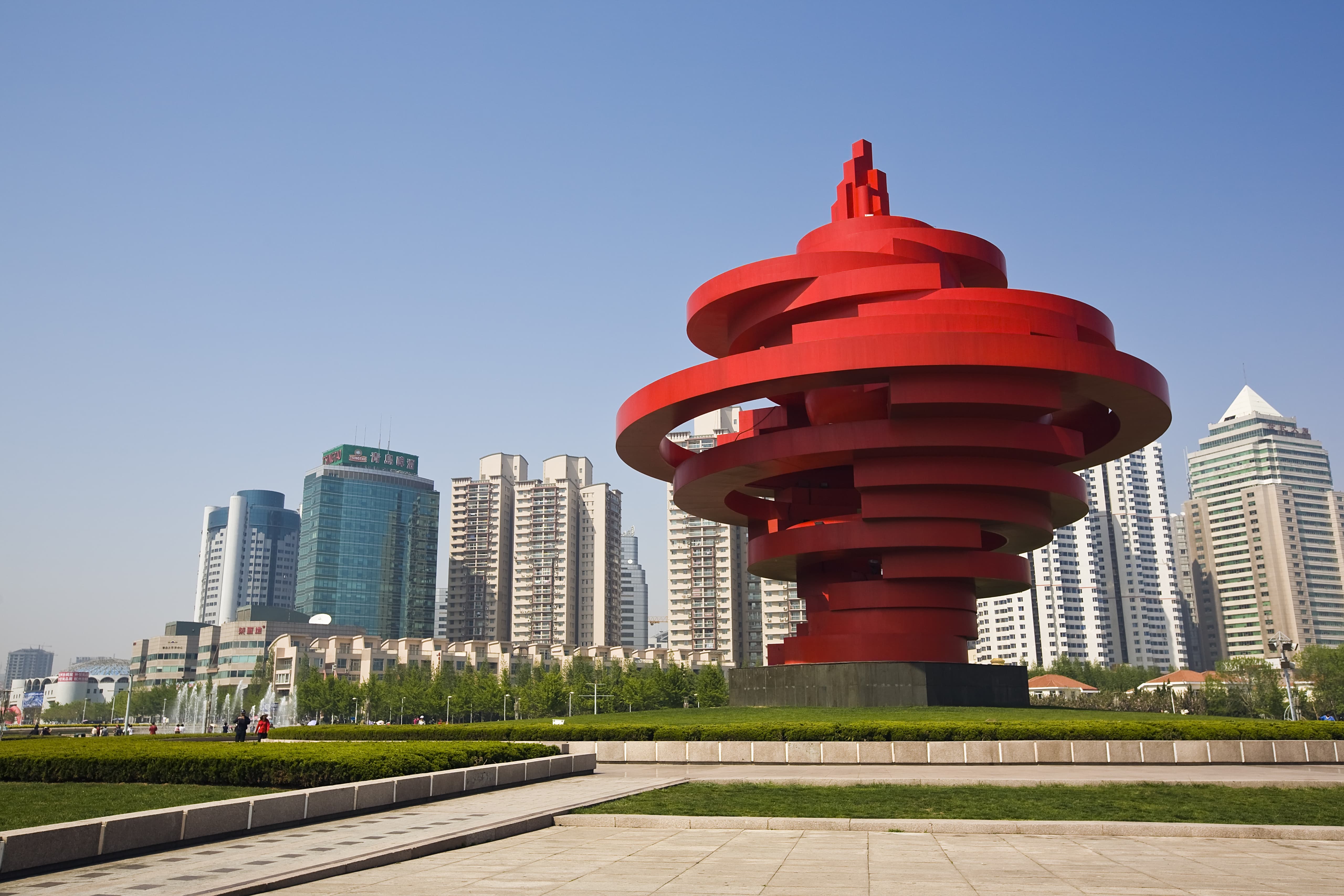 五四廣場為紀念五四運動中學生捍衛青島主權的愛國運動所建,著名的紅色雕塑『五月的風』更是青島最著名的地標。