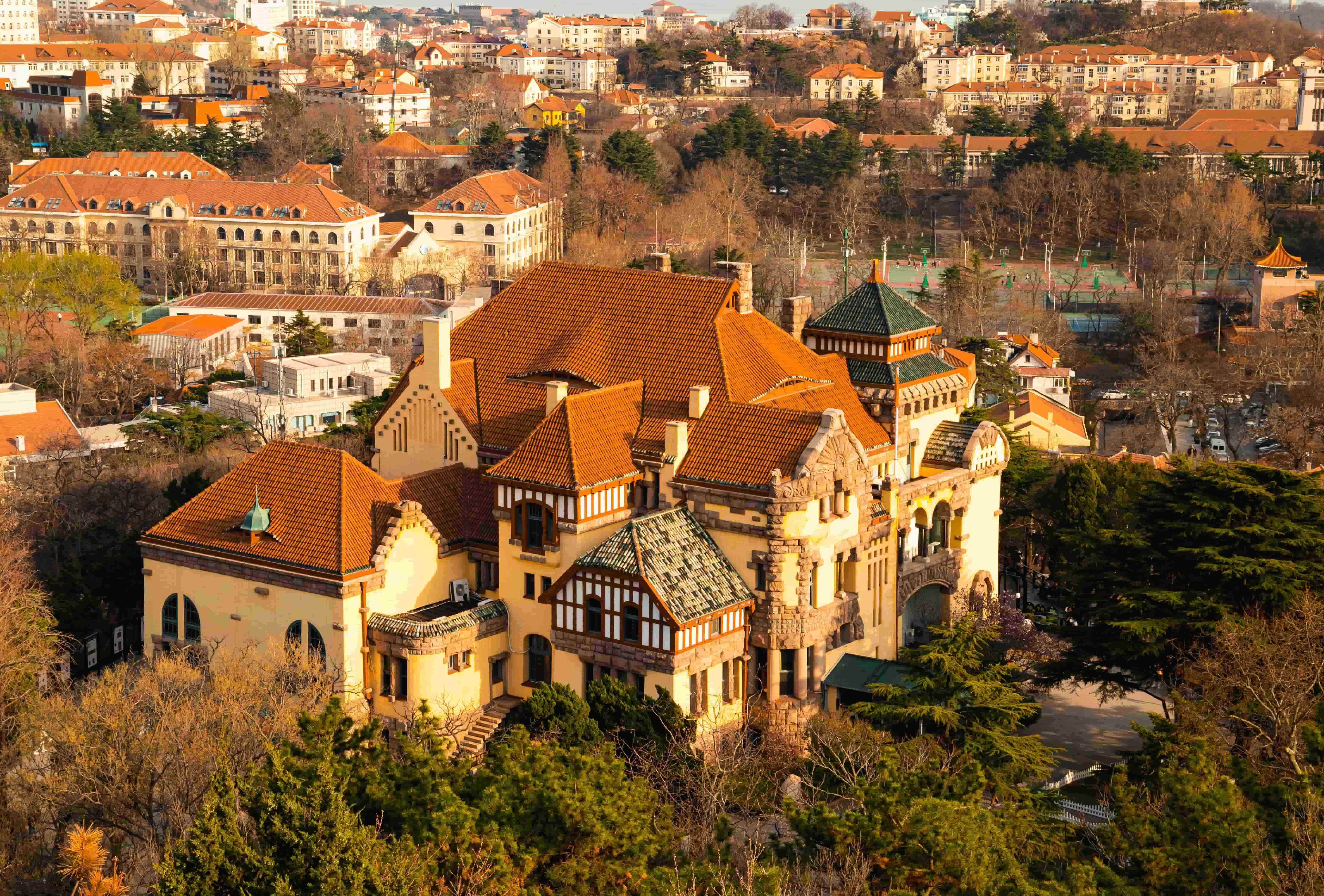 迎賓館前身為德租時期的德國總督駐膠澳官邸,建築手法結合德國威廉時代典型式樣及青年風格派,黃色牆壁、紅色屋頂,以不對襯的建築風格著名。