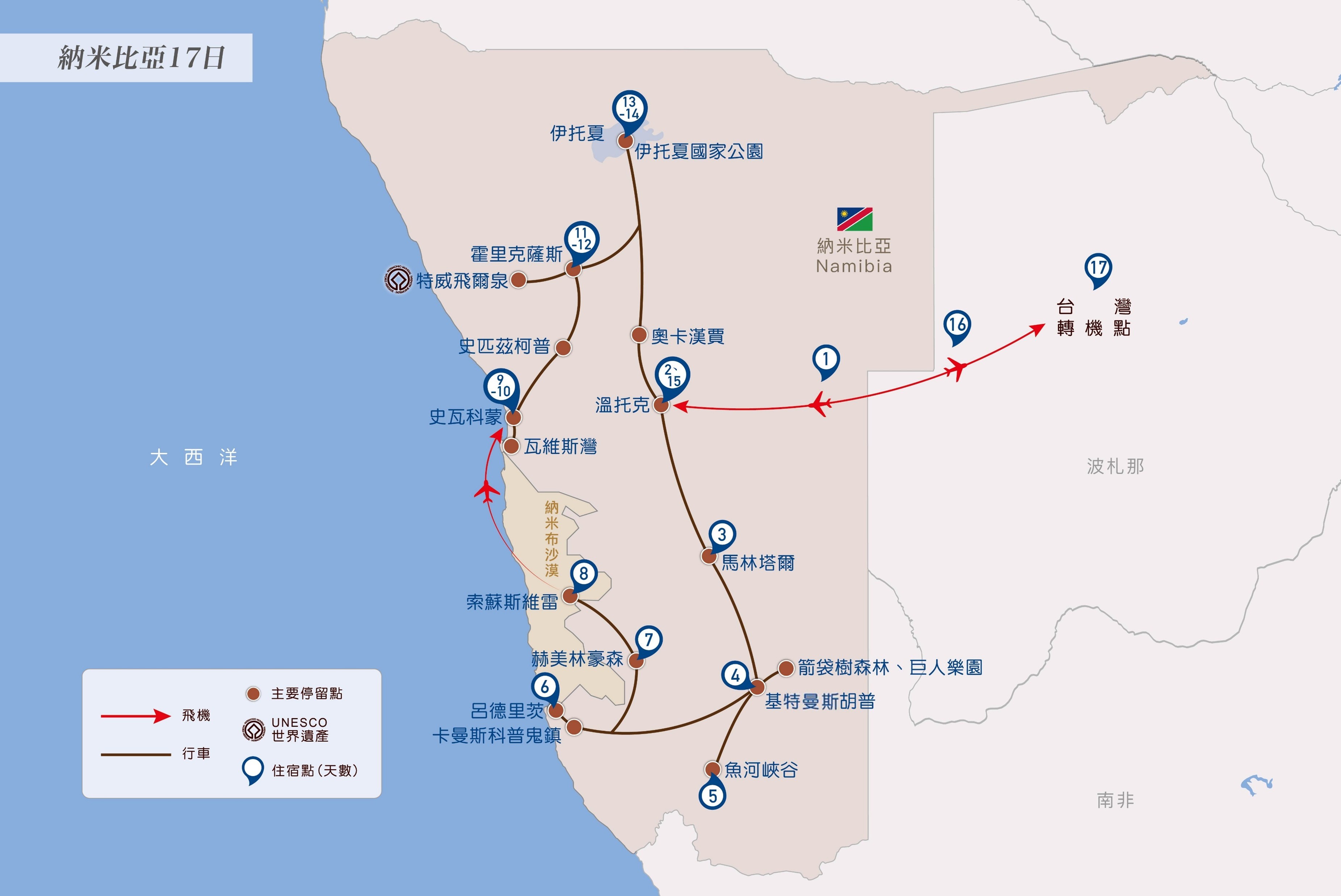 位於非洲西南部,原名西南非。曾被多個國家殖民,可以在各地看到不同風情,看似衝突卻有平衡之美。地貌瑰麗多姿,可分沙漠、叢林和海岸3大區。既有不可思議的紅色沙海,也有蒼翠的伊托夏國家公園,不僅有肅穆蒼涼的骷髏海岸,更有靜謐優美的瓦維斯灣瀉湖。