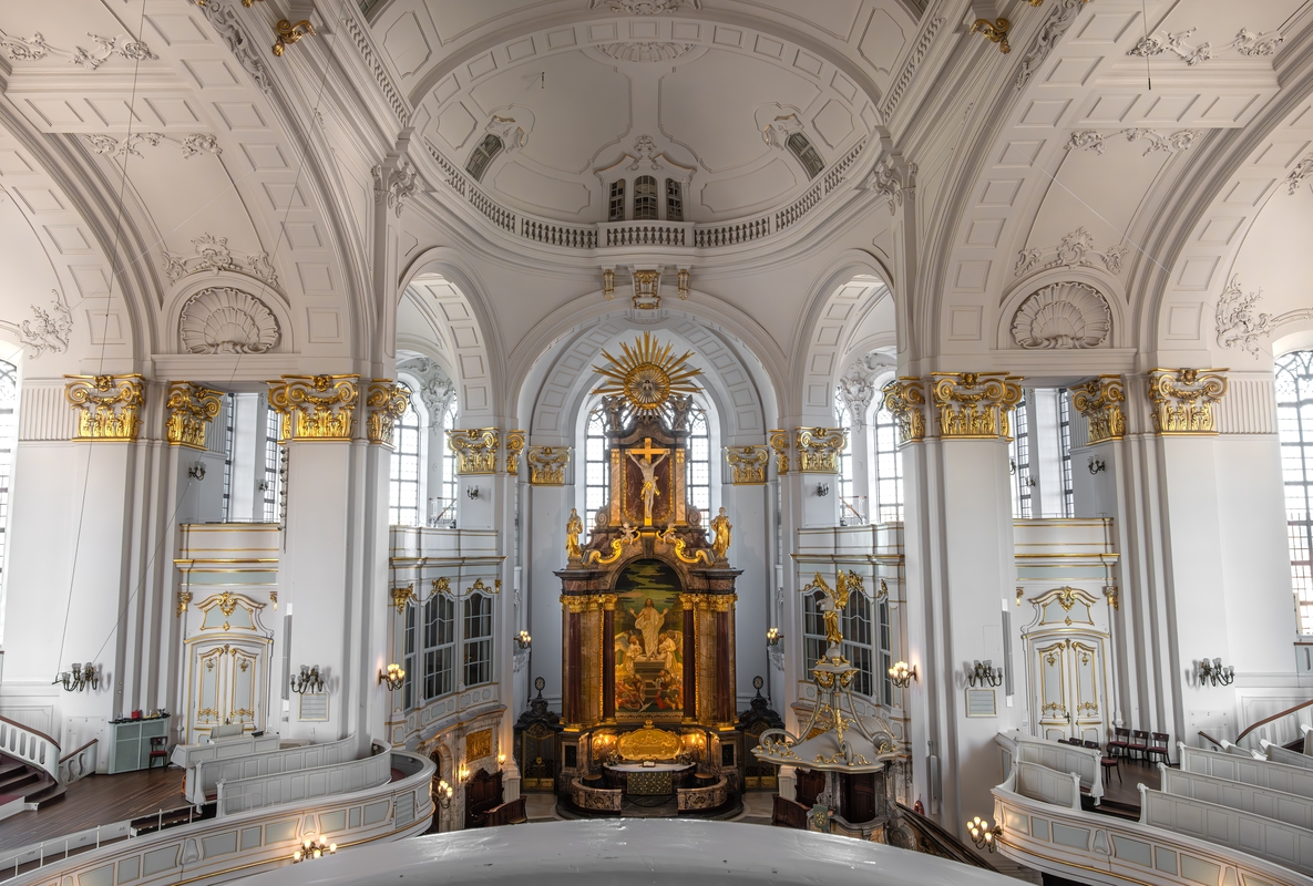 被暱稱為「Michel」,是漢堡著名的巴洛克地標。其132公尺高的銅頂尖塔曾是易北河船隻入港的航標,登上觀景台可將漢堡港全景盡收眼底。教堂正門有天使長米迦勒戰勝魔鬼的青銅像,內部則以高雅的白金配色與五座管風琴聞名。