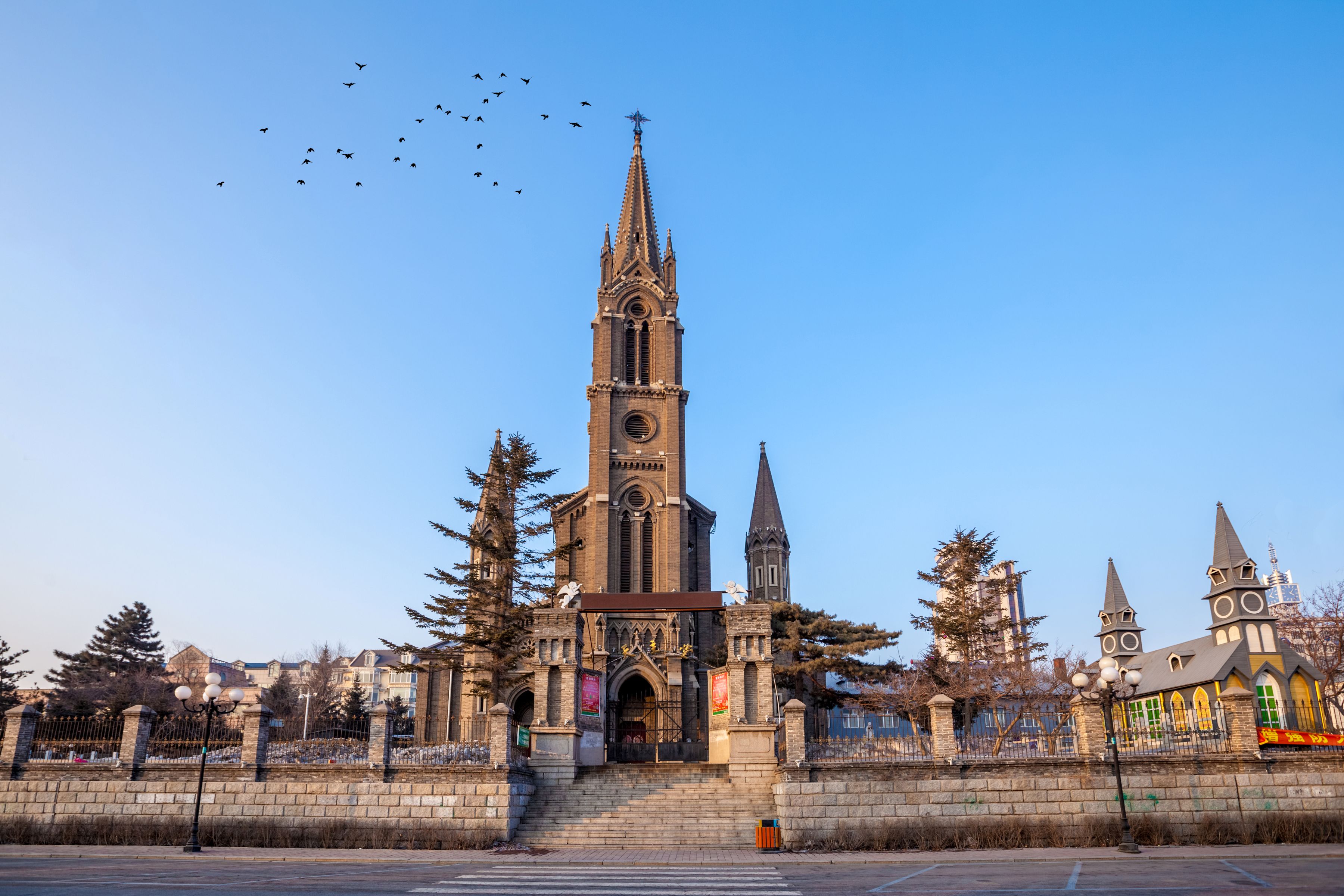 吉林天主教堂,聖名「耶穌聖心堂」,為典型的哥德式建築,雪覆哥特尖頂,銀裝素裹的百年鐘樓靜訴信仰之美。冰晶閃爍的松花江畔,暖黃燈光與純白世界交織成神聖畫卷,冬日彌撒的鐘聲裡,邂逅北國最寧靜的浪漫。