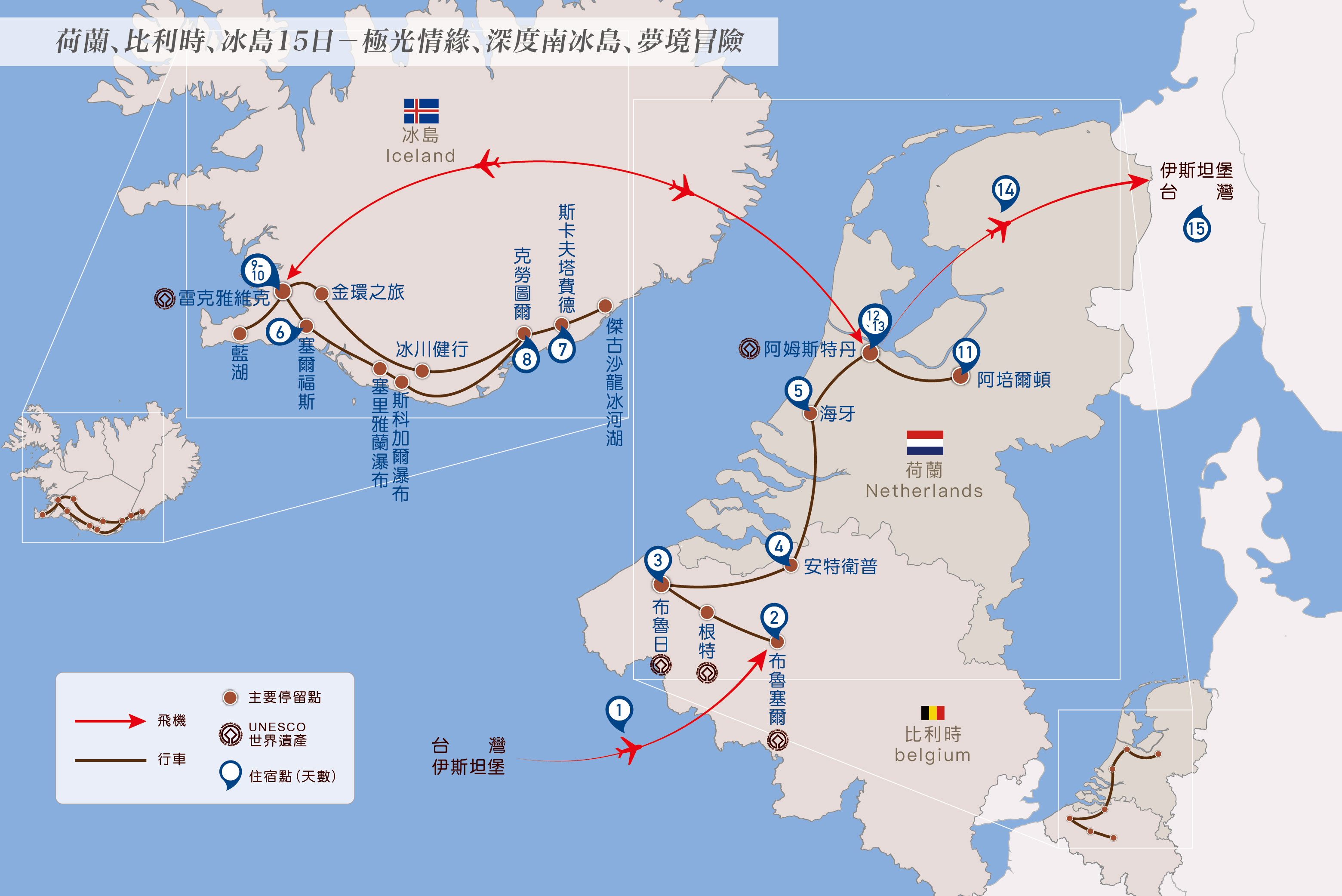 7. 荷比每人每天一瓶礦泉水(冰島水質優良僅在行程第一天提供每人一瓶礦泉水),西式午餐提供咖啡或茶、西式晚餐提供一杯飲料