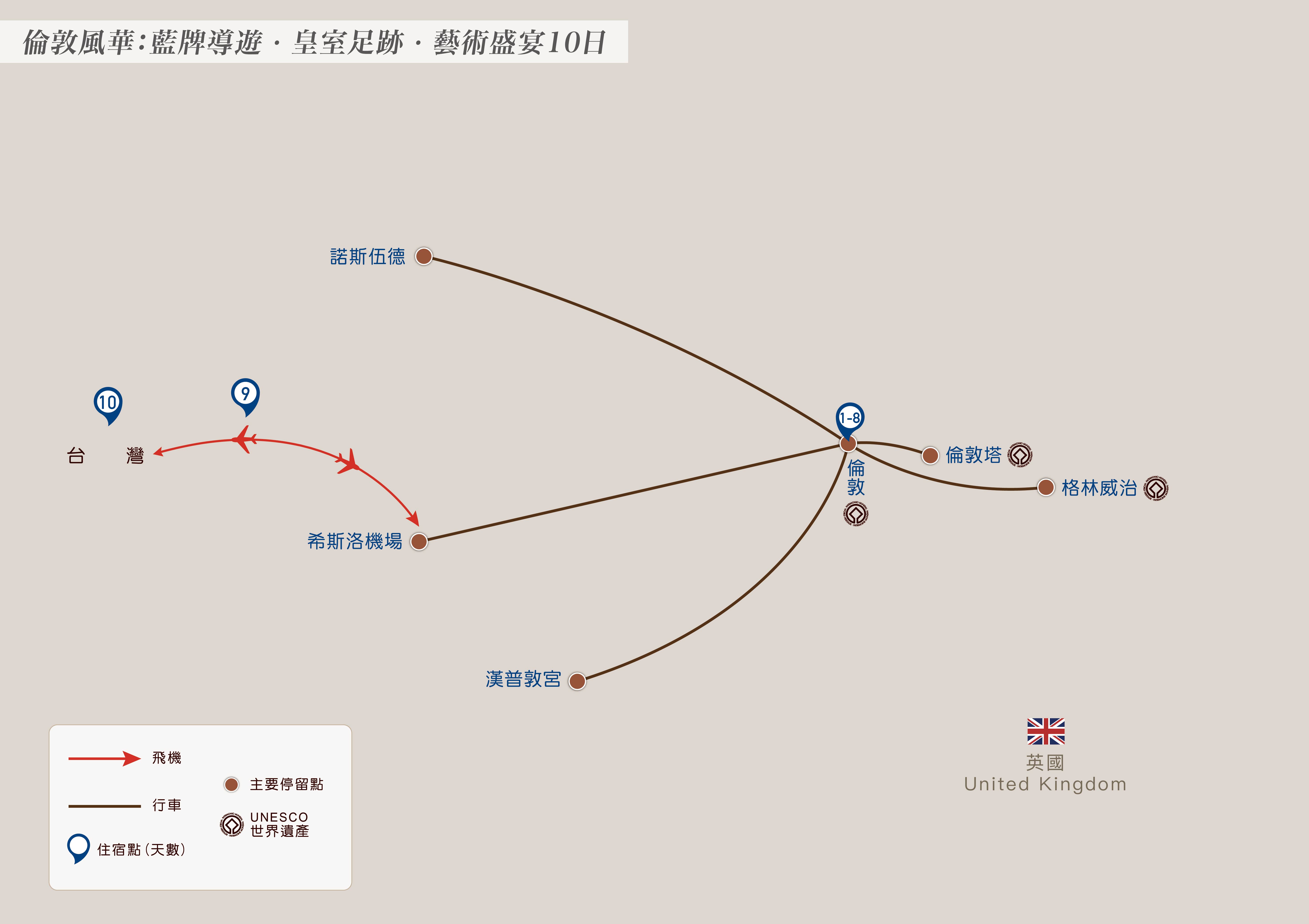 今日於桃園機場集合,搭乘豪華客機前往英國首都倫敦,當日傍晚抵達倫敦。