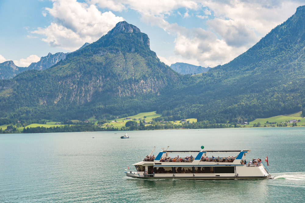 聖沃夫岡湖面積約13平方公里,最深處達114公尺,湖水清澈如鏡。從湖畔啟航,遊船悠然串連聖沃夫岡與聖吉爾根,穿梭於湖光山色之間,湖風吹拂,詩意浪漫,恍若置身流動畫卷;途中更可遠眺湖畔地標白馬寺飯店,典雅身影映襯群山湖景,格外動人。