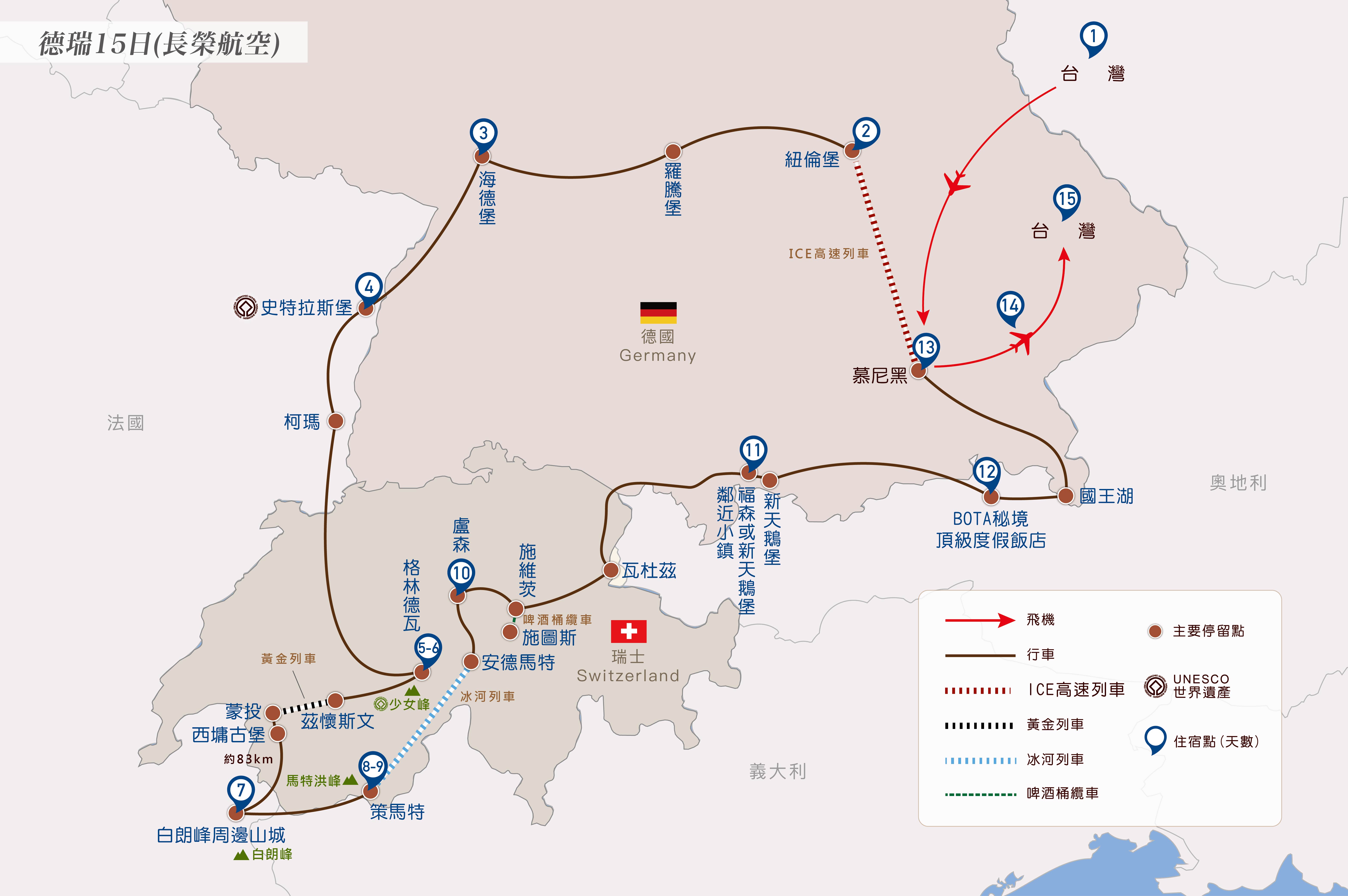 2.如遇慕尼⿊商展或活動期間客滿,配合航班時間優先改⼊住近機場四星旅館並每人退費1,500元,敬請⾒諒。
