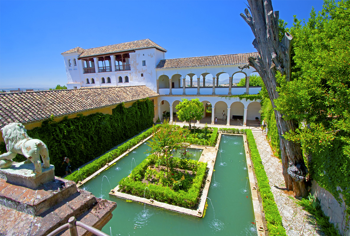 位於阿爾罕布拉宮旁,建於13世紀,為納斯瑞德王朝的夏宮與避暑勝地。花園以層疊水池、潺潺水道與幾何對稱的庭園設計聞名,玫瑰、橄欖與柏樹交織其間。最著名的「水渠庭院」長池倒映拱廊與藍天。此處可遠眺內華達山脈,被譽為伊斯蘭園林藝術的典範。