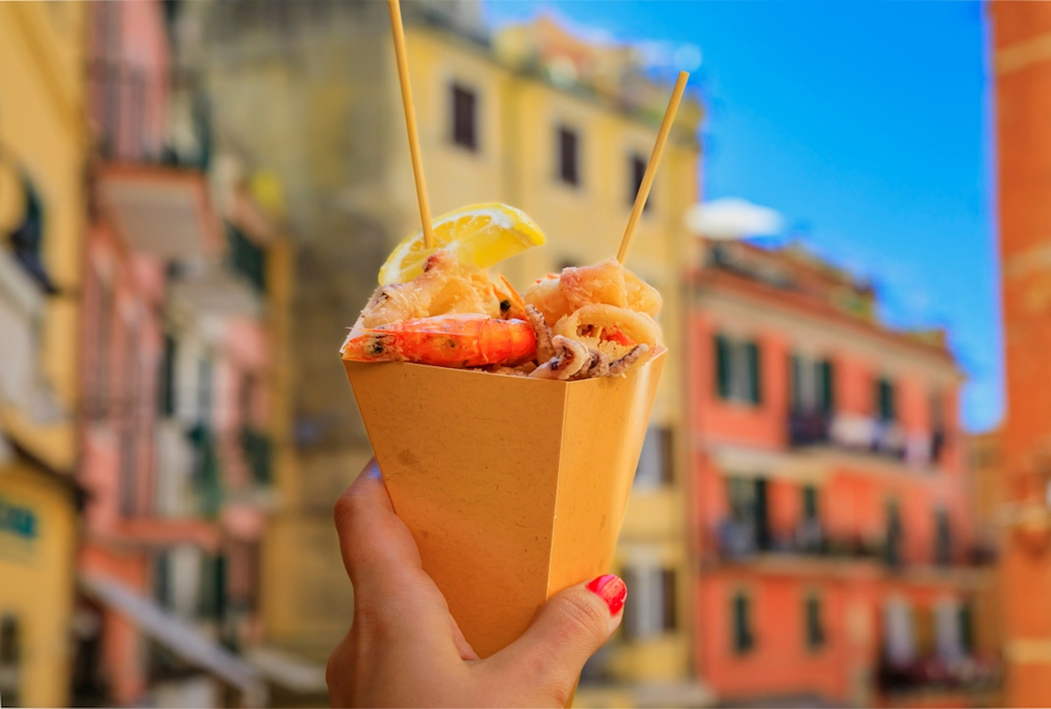 五漁村的飲食文化深受海洋與利古里亞傳統影響,當地餐廳或港口邊都有很多當地必吃街頭小食:熱內亞青醬麵、佛卡夏特色麵包,口感鬆軟,可以單獨品嚐,或作為配料搭配青醬與海鮮。炸海鮮是體驗當地風味的熱門選擇,包含炸鯷魚、炸花枝等。