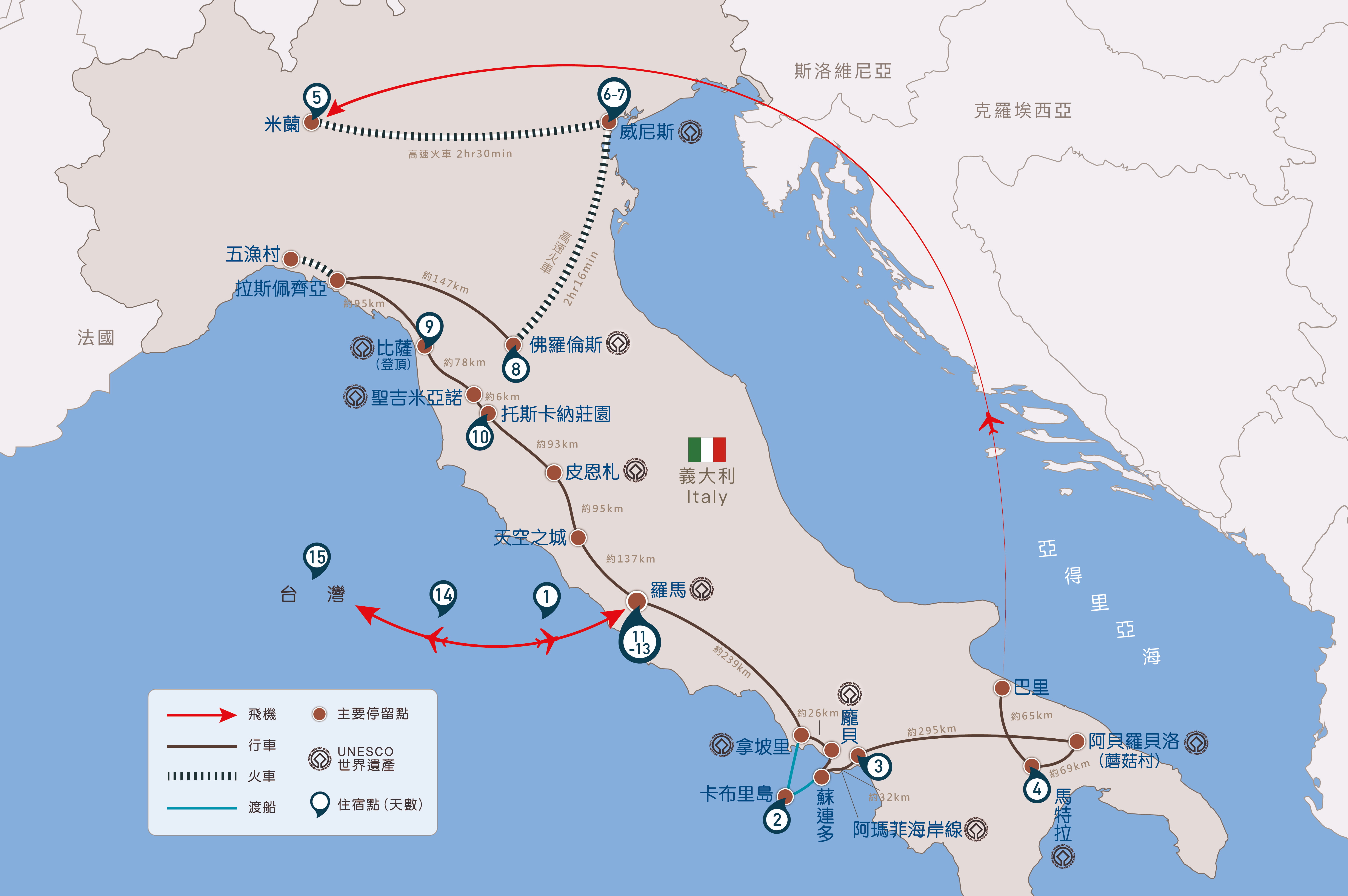 2. 除了專業服務的隨團領隊,義大利於城市中穿插安排當地具執照專業導遊提供詳細的導覽及解說。