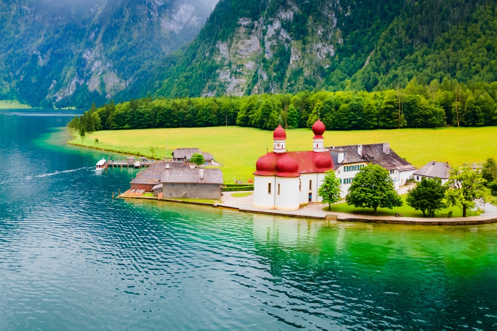 位於國王湖西岸,始建於12世紀,17世紀改建為巴洛克風格。其紅色洋蔥圓頂與白色牆身極具辨識度,靈感源自薩爾茨堡大教堂。建築小巧卻精緻,內有祭壇與壁畫,散發濃厚宗教氛圍。僅能搭乘遊船或健行抵達,教堂與碧綠湖水、阿爾卑斯群山交織,宛如童話仙境。