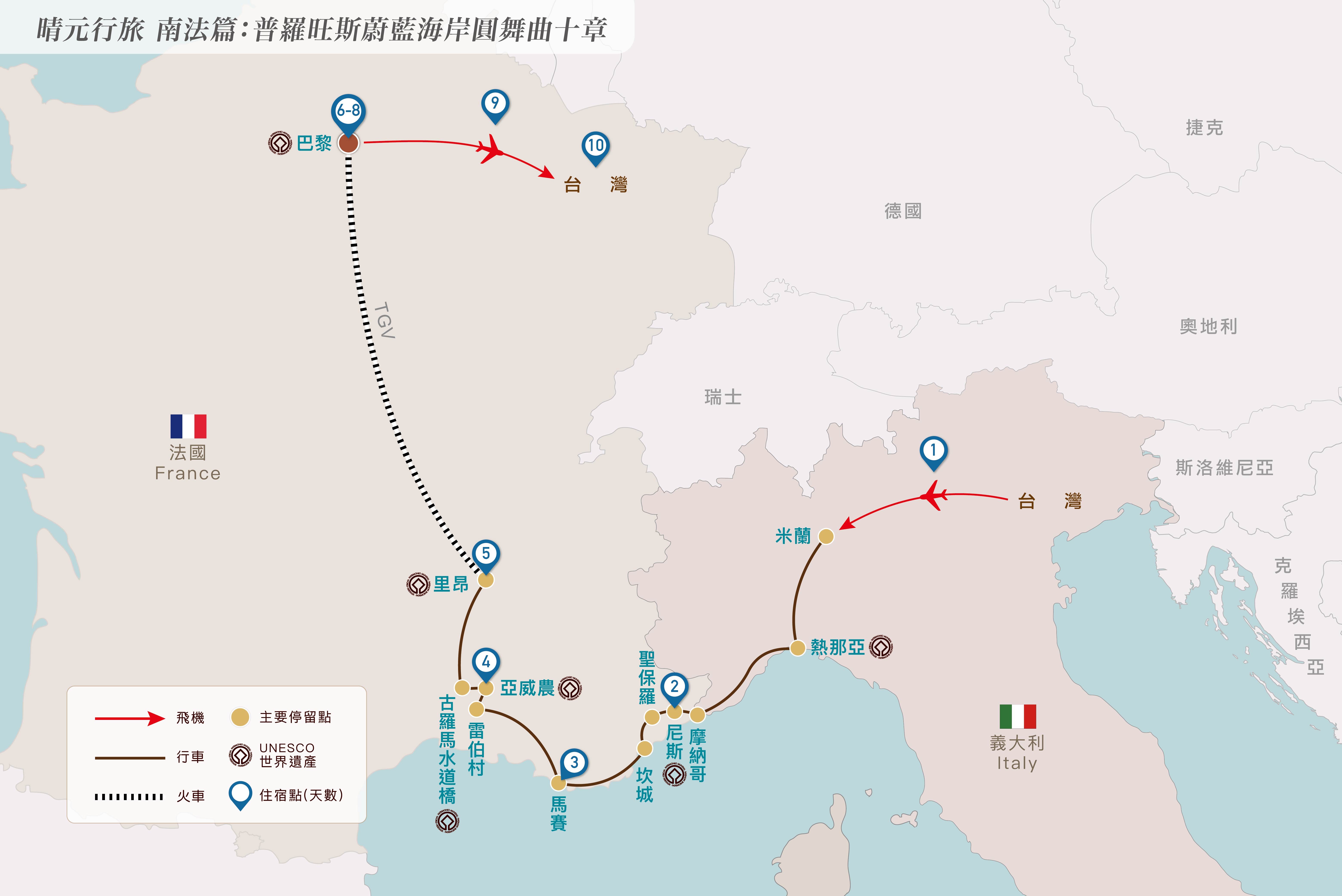 早餐:旅館早餐 午餐:地中海風情料理 晚餐:馬賽魚湯經典料理
