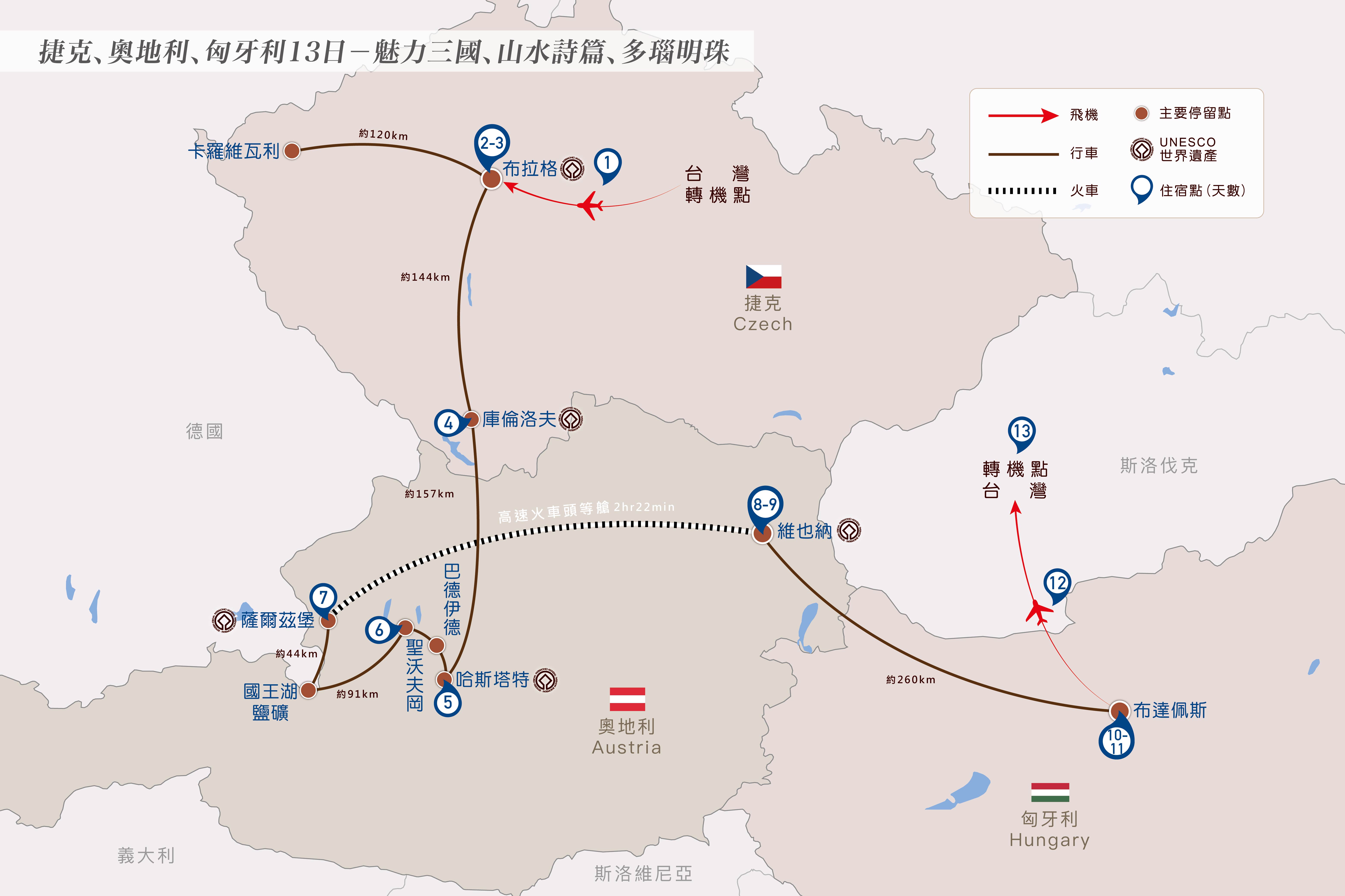 今日桃園機場集合,搭乘阿聯酋航空經杜拜飛往百塔之城布拉格。隔日中午抵達,展開精彩的【 捷奧匈魅力三國13日】。