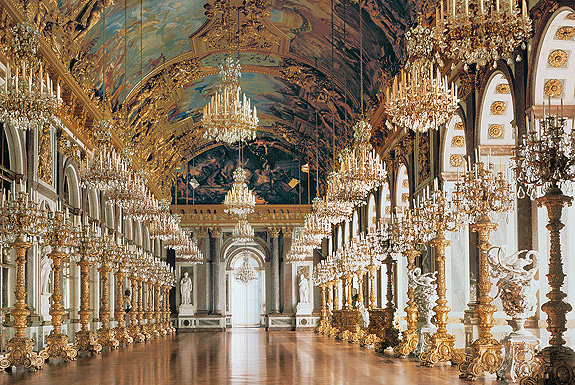 海倫基姆宮的鏡廳,由巴伐利亞國王路德維希二世下令建造,是凡爾賽宮鏡廳的仿製品,旨在向上帝王路易十四致敬。其98米的長度甚至超越了凡爾賽宮,廳內裝飾極盡奢華,天花板濕壁畫描繪路易十四的生平,輔以33座水晶吊燈與鍍金灰泥雕塑。