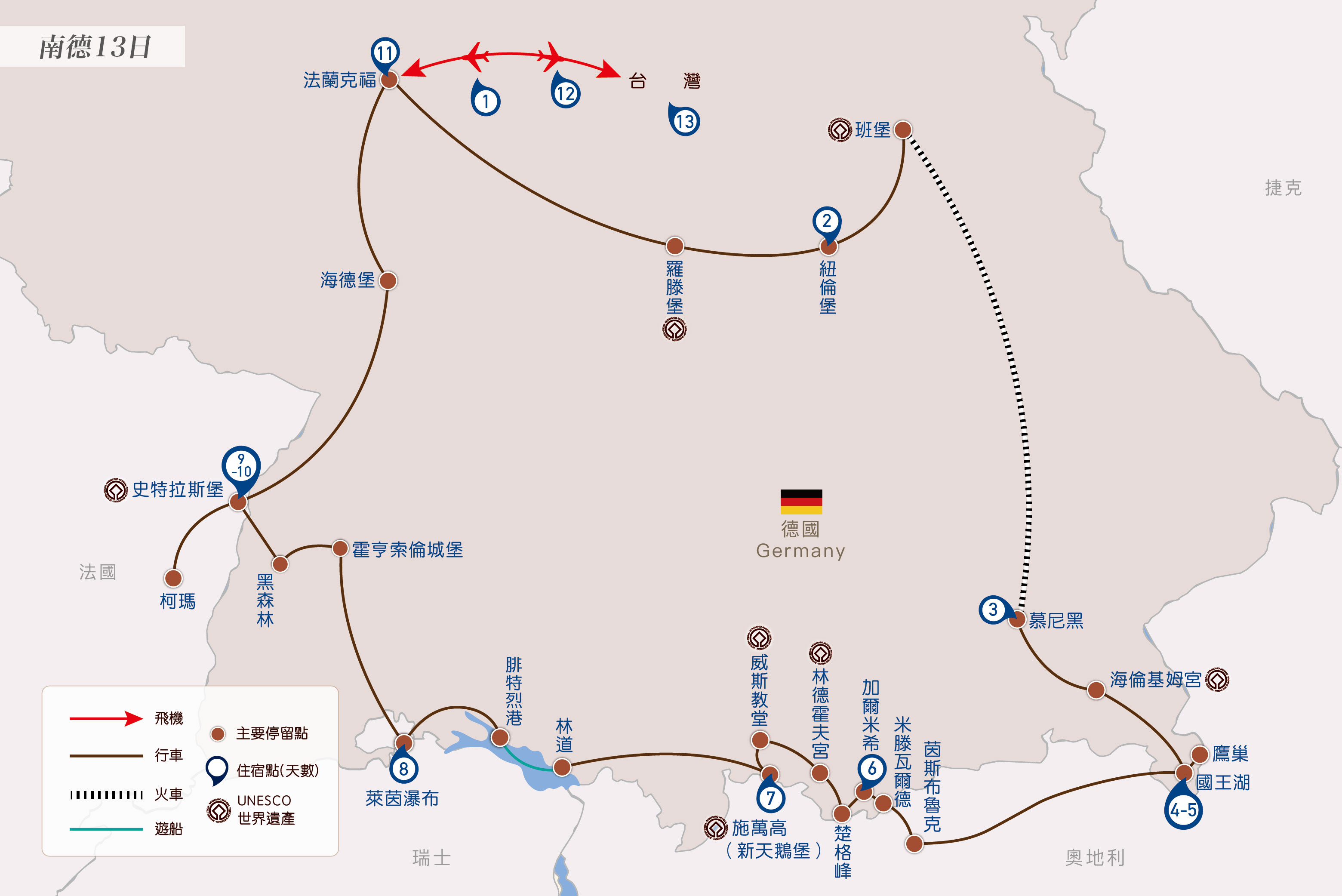 從童話古堡的夢幻壯麗,到國王湖的翡翠湖光,再到亞爾薩斯的浪漫詩意,每一步都留下難忘印記。沿途體驗城市風貌、藝術人文與在地美食,滿載感動而歸。