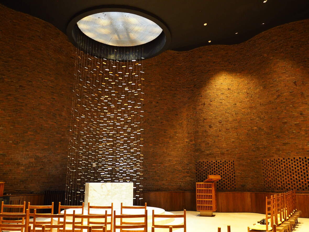 禮拜堂外立面與一般印象中的宗教空間不太相同,而是一個簡單的圓柱形建築及一連串延續且無窗的紅磚牆。內部的光的瀑布經由這些金屬片的折射與移動,創造了一種擁有穿透靈魂並令人印象深刻的神聖感。