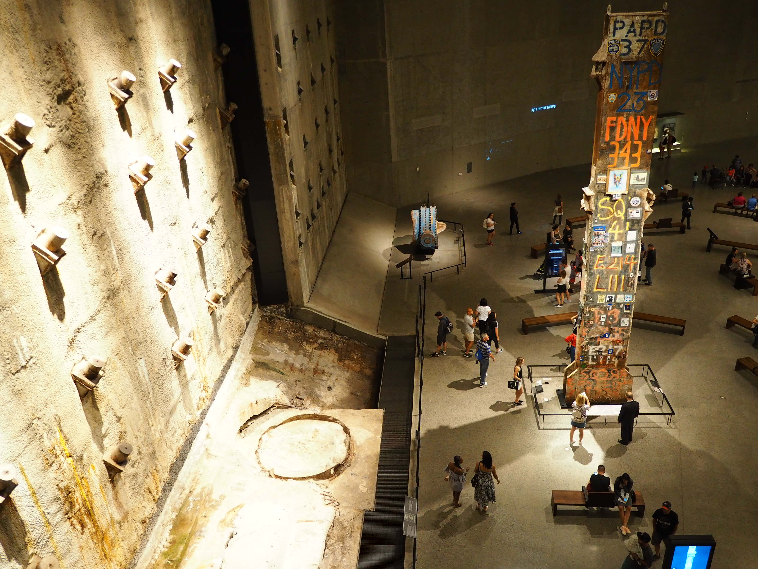 紀念館建在雙子星塔原址向人們講述911的故事,遺址旁的地面廣場有兩個巨型凹陷立方體的花崗岩水池,水從池壁緩緩流下呈現出寧靜恣態。顯眼的18公尺高的連續牆,為原1966年建築時設置的,雙塔坍塌時這面牆沒有崩塌象徵了不屈不撓的精神。