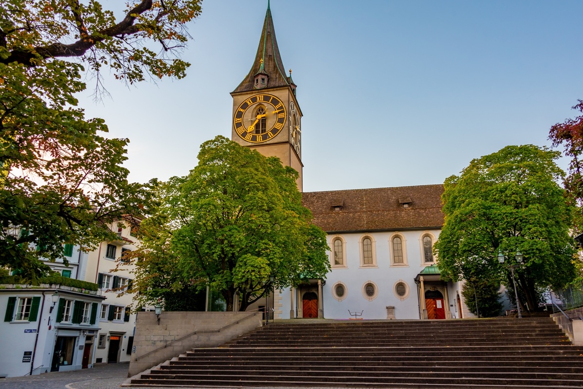 蘇黎世最古老的教區教堂,歷史可追溯至9世紀。塔樓上是歐洲最大的教堂鐘面,直徑8.7公尺,巨大的金色指針在藍天下精準運行,數百年來指引著城市的作息。內部典雅的巴洛克式裝潢、細緻的灰泥雕飾與橘紅色調的樑柱,與樸實的塔樓外觀形成強烈對比。