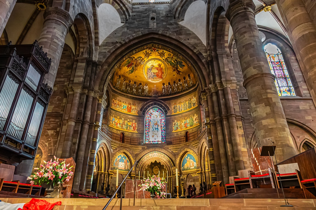 被視為晚期哥德式建築的巔峰傑作。該座堂主要建於1176-1439年間,外觀採用孚日山脈特有的粉紅色砂岩砌成,隨日光變化呈現獨特色澤。大文豪雨果曾形容其為「巨大與精緻的奇蹟」。教堂內部以華麗的12紀紀玫瑰窗及精密的文藝復興天文鐘聞名。
