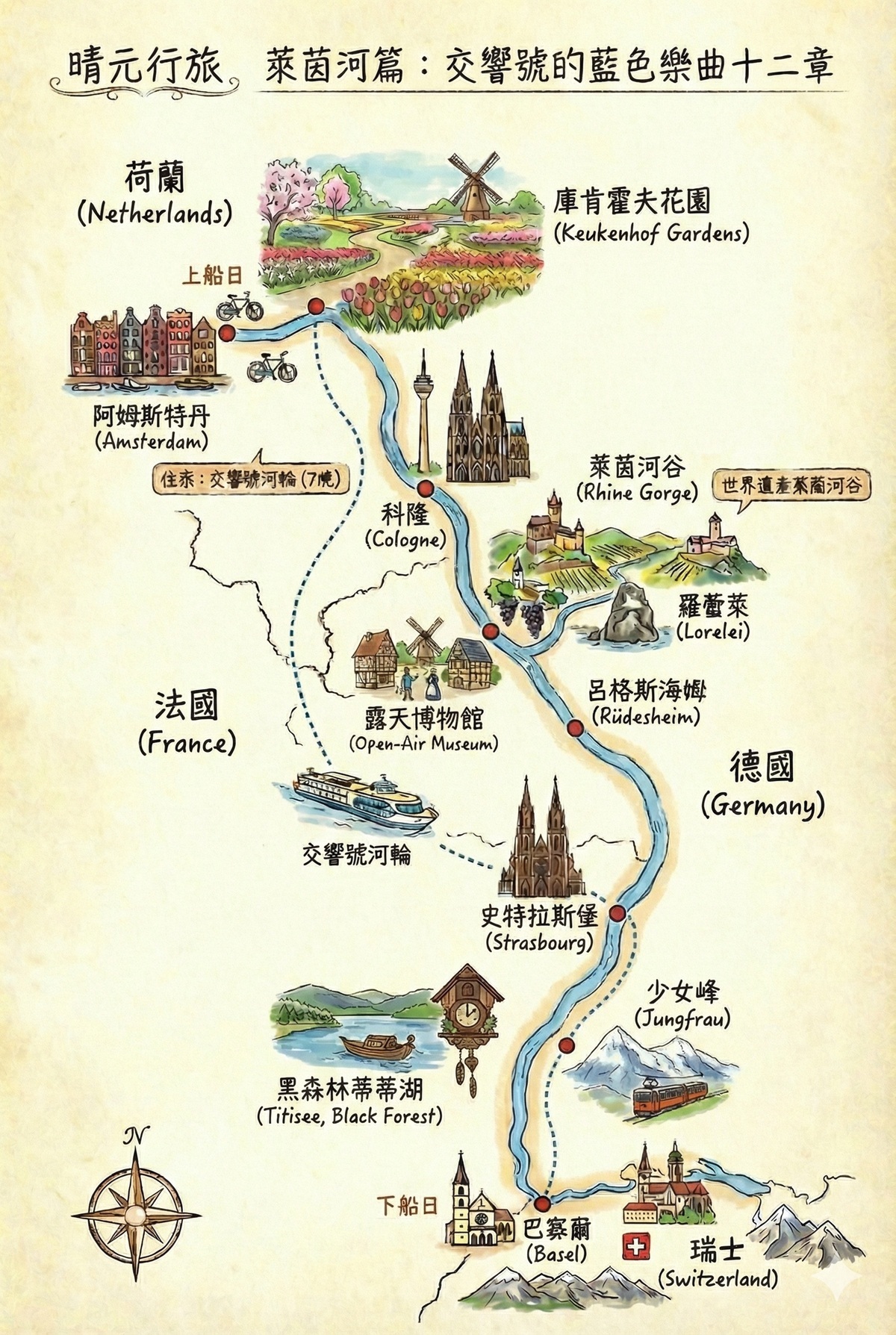 早餐:河輪自助式 午餐:德式風味餐+啤酒 晚餐:河輪精緻套餐(含酒水)