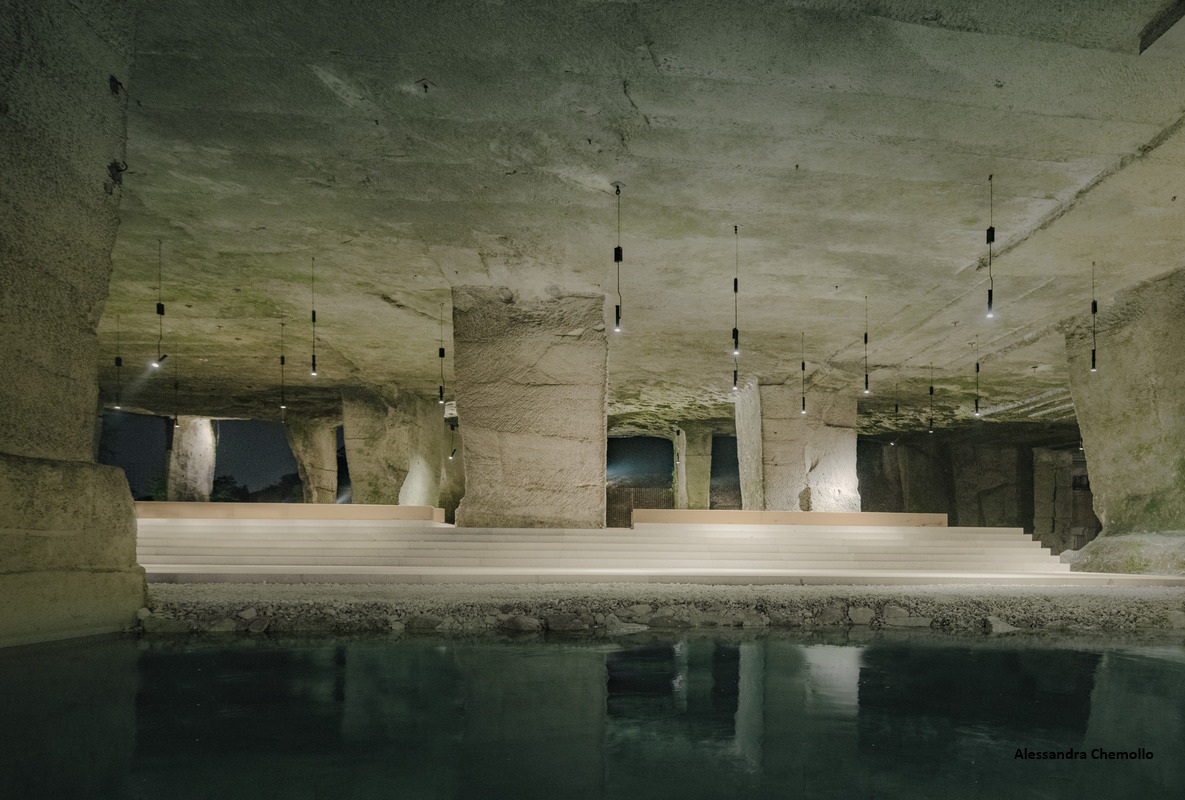阿卡里采石洞穴由2023年普立茲克建築獎得主英國建築師David Chipperfield設計,設計靈感源自古羅馬劇場的階梯式座位。建築師尊重採石過程中形成的巨大且不規則的石柱,將其視為支撐整座藝術聖殿的自然樑柱。
