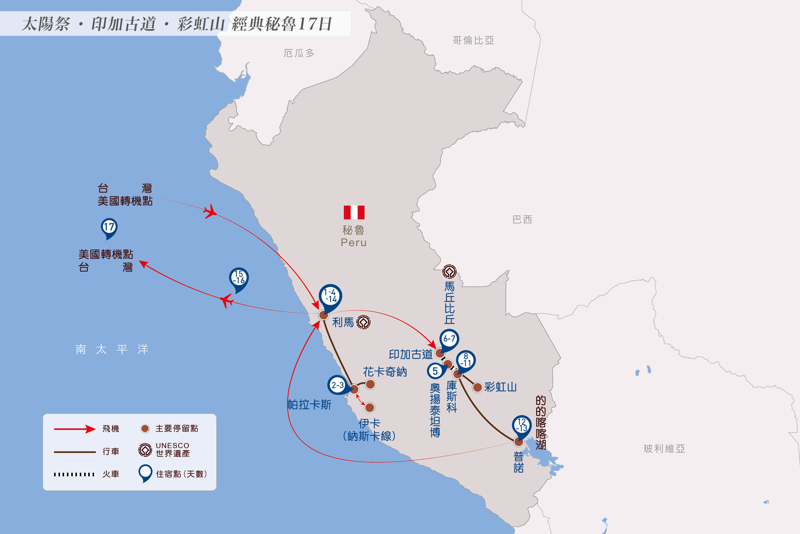 祕魯全覽行程搭乘凌晨航班即將與利馬道再見。提醒您注意機上保濕,建議準備⼝罩、⽿塞、眼罩、⾶機枕等物品,幫助您在⻑途⾶⾏中安然舒適⼊眠。