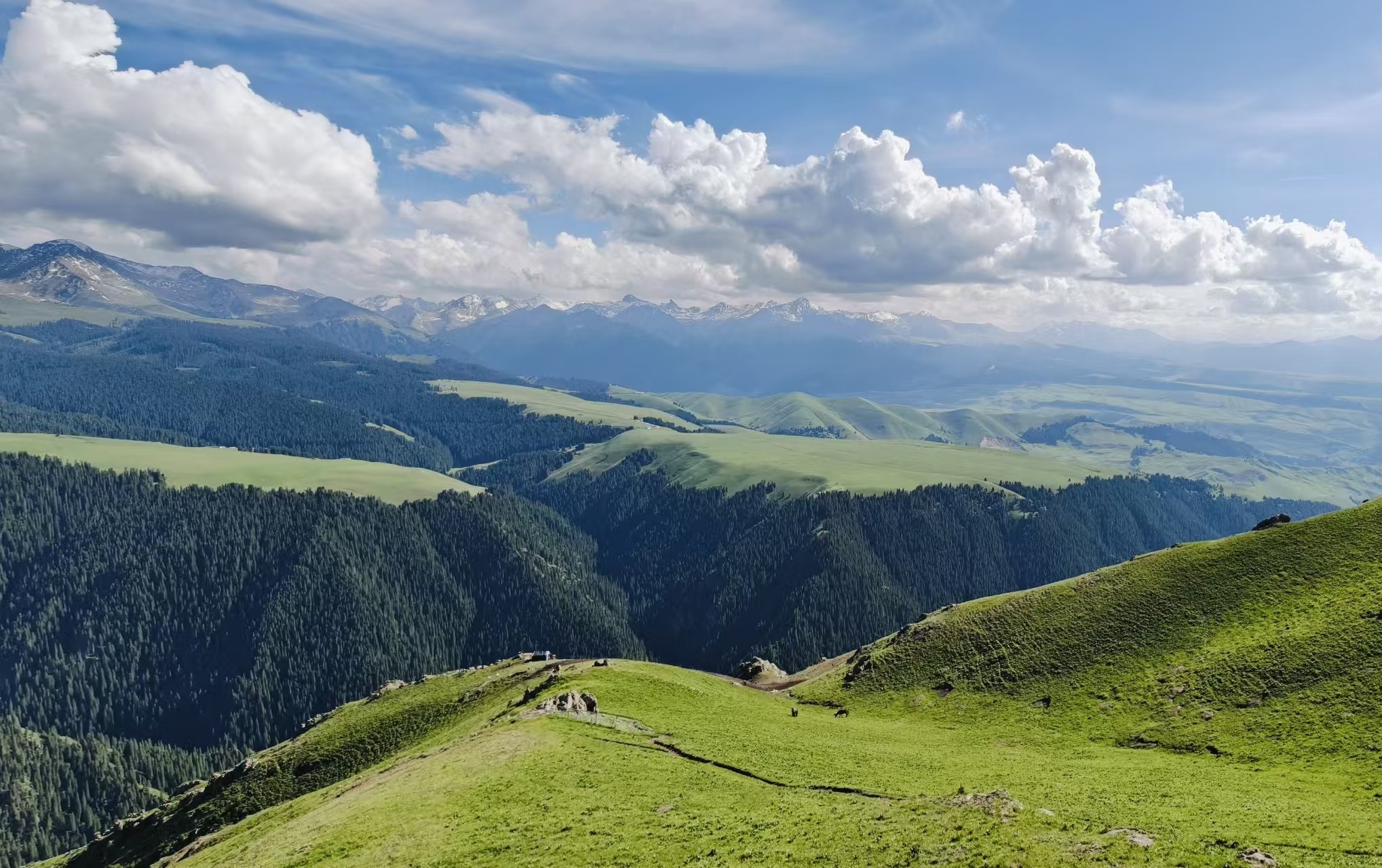 海拔約2500米,是“新疆100個最美觀景拍攝點”之一,以其開闊的視野和獨特的民族文化背景著稱。獵鷹台緊鄰庫爾代森林大峽谷,視野覆蓋雪山、草原、森林與峽谷地貌,形成全景式觀景平台,是拍攝“人體草原”曲線與峽谷縱深的熱門點位。