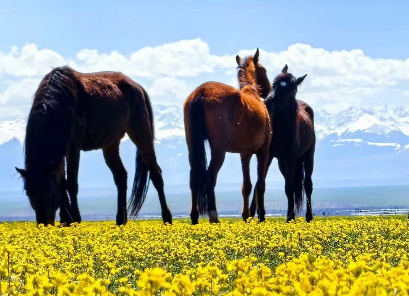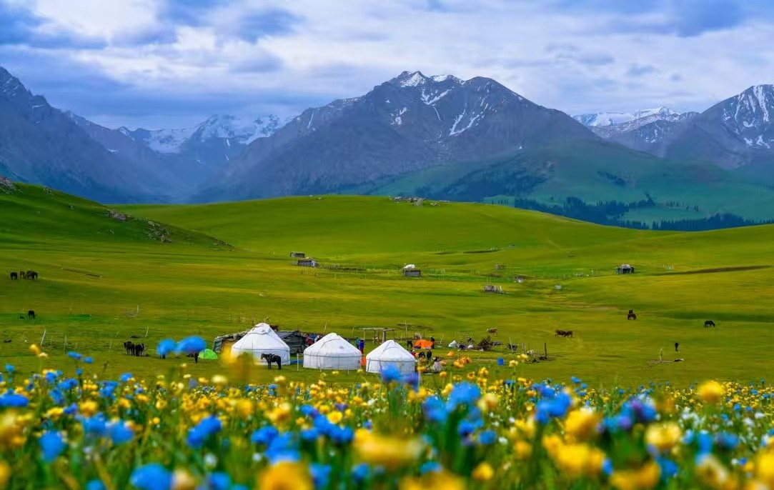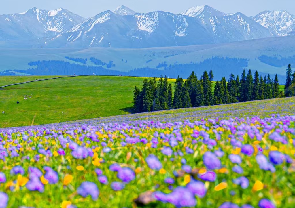 五花草甸是喀拉峻大草原的核心精華景區之一,位於東喀拉峻區域,以連綿起伏的五彩花海和雪山背景聞名,被譽為“空中花園”。每年5月下旬至7月,上百種野花次第盛開,形成色彩斑斕的高山草甸,與遠處的雪山、森林交相輝映,構成“立體草原”的絕美畫卷。
