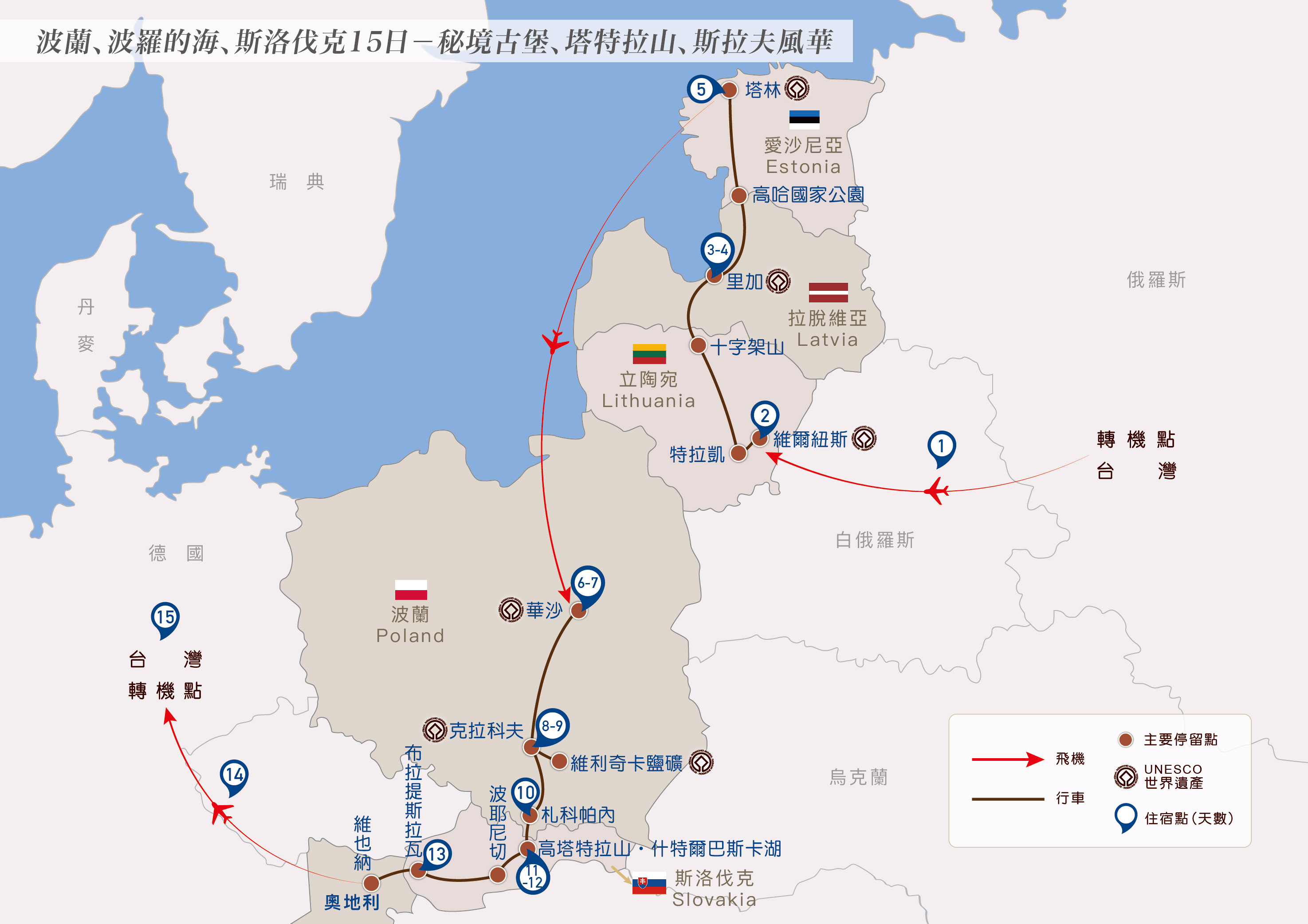 4. 波羅的海三國、波蘭、斯洛伐克皆為申根公約國,台灣護照享有入境90天內免簽證待遇。如持有其它國籍護照,請先確認是否需申辦簽證。