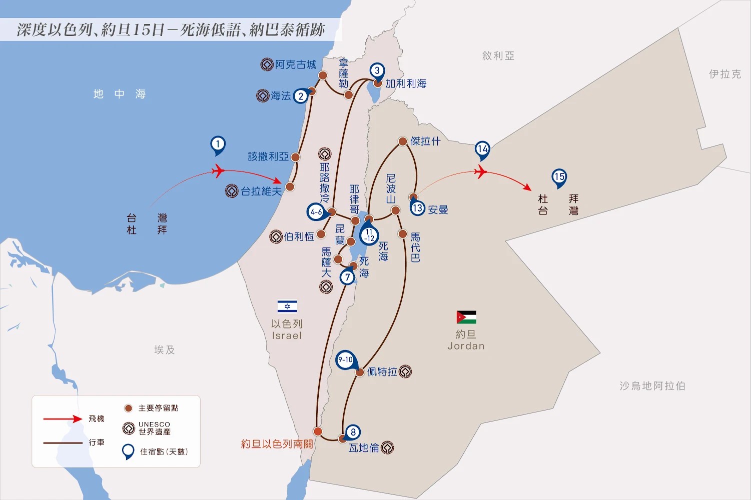 ⾏程安排約旦及以⾊列“雙”死海之旅,地理位置上,約旦端死海飯店位於北側,以⾊列端則位於死海南端的鹽湖,景緻上呈現出不同⾵貌,在以⾊列端可欣賞死海岸的特殊地貌景觀。
