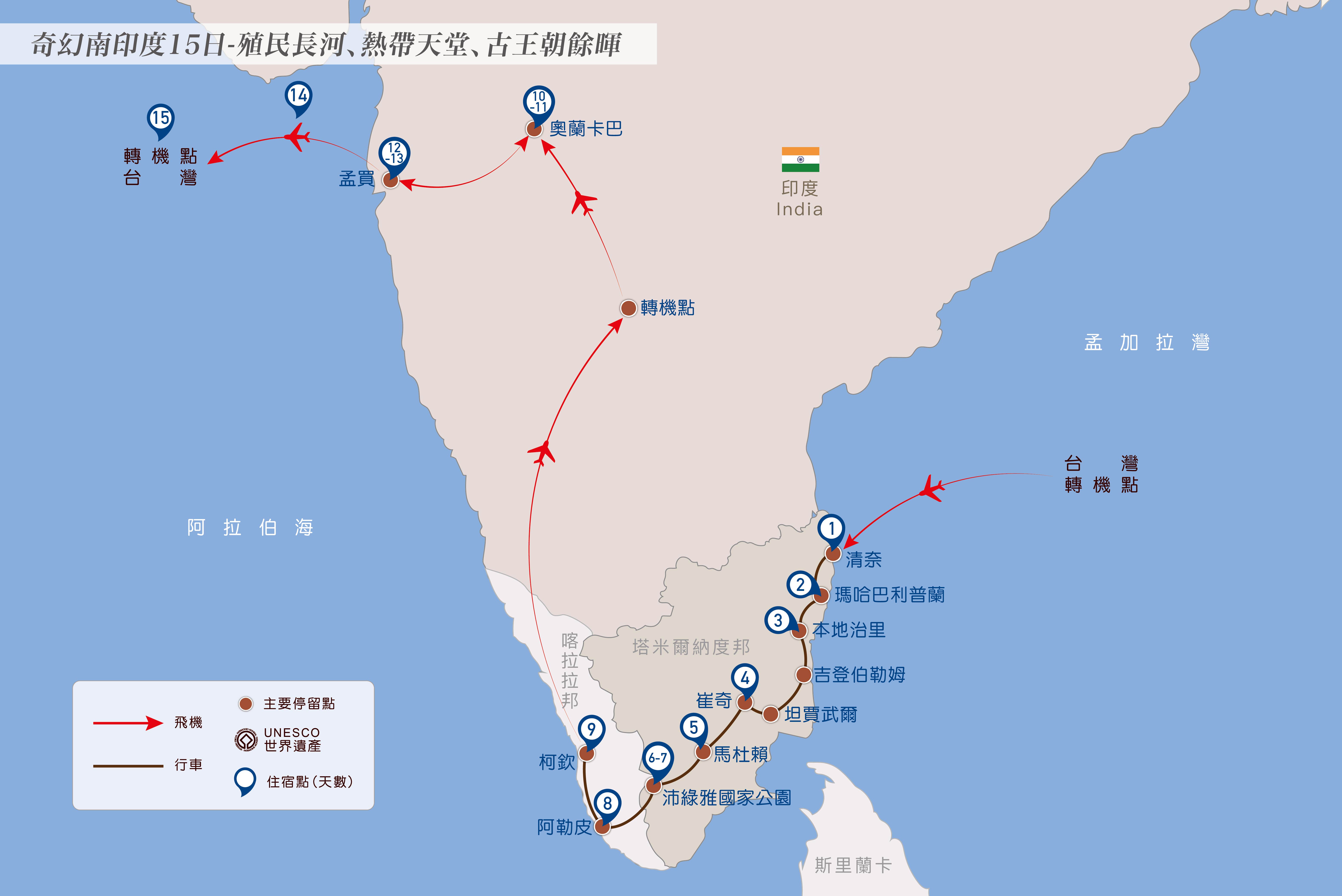 今日轉機抵達南印大城清奈,印度安檢入境檢查手續嚴格,入關手續排隊耗時,抵達飯店時間已為凌晨,請您耐心等侯配合領隊指示團體行動,謝謝您的配合。