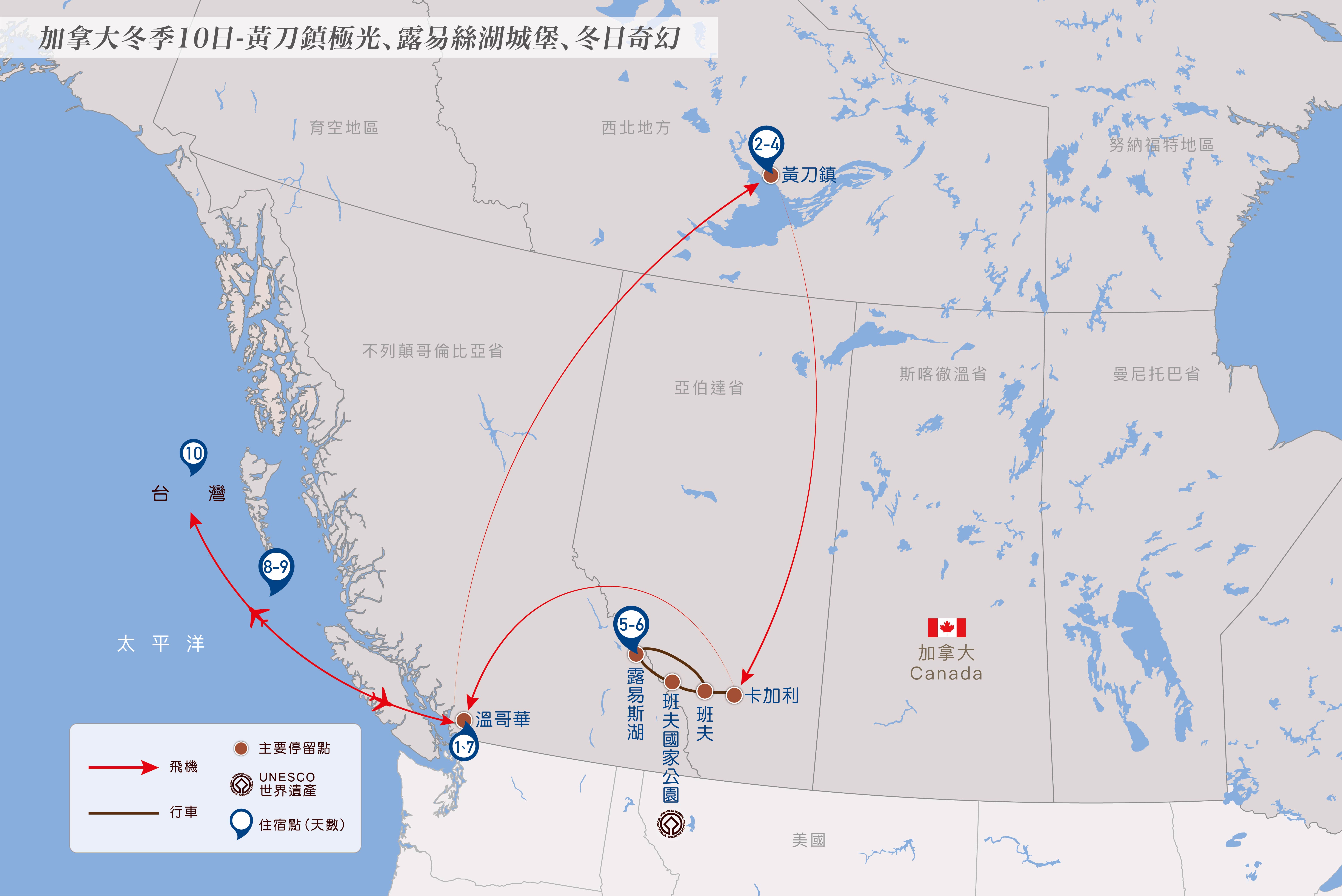 *進出黃刀鎮航班選擇有限,若遇直飛航班客滿或不提供團體機位,則改以轉機航班替代。