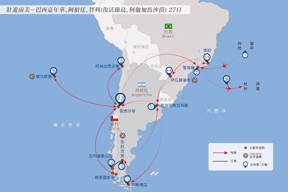里約熱鬧非凡的嘉年華遊行、壯麗的伊瓜蘇瀑布、百內連綿山峰、阿他加馬沙漠、復活節島摩艾,這趟壯麗的南美行,是否已在生命歷程裡寫下壯闊的一章? 今天即將為此趟旅程劃下完美句點。凌晨於聖保羅搭乘舒適的阿聯酋航空,行經杜拜轉機