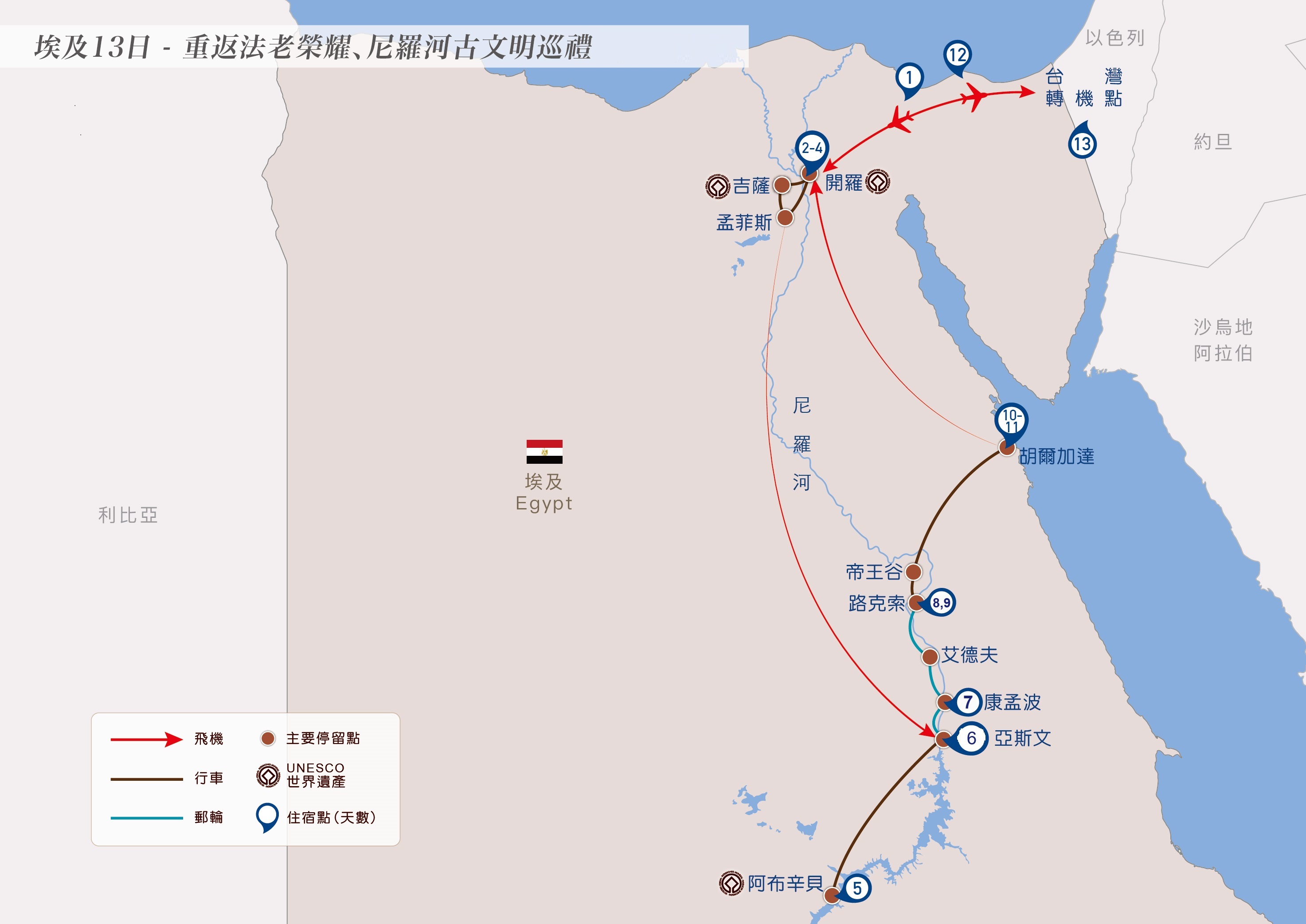 資數十億美元建造的大埃及博物館佔地近4.5公頃,內部設有12個展廳。其規模之大,世界上最大的考古博物館,讓人們有如站在金字塔前一樣感到震撼,因目前僅開放特定區域,故用心安排讓各位貴賓能先一睹他的神祕面貌。