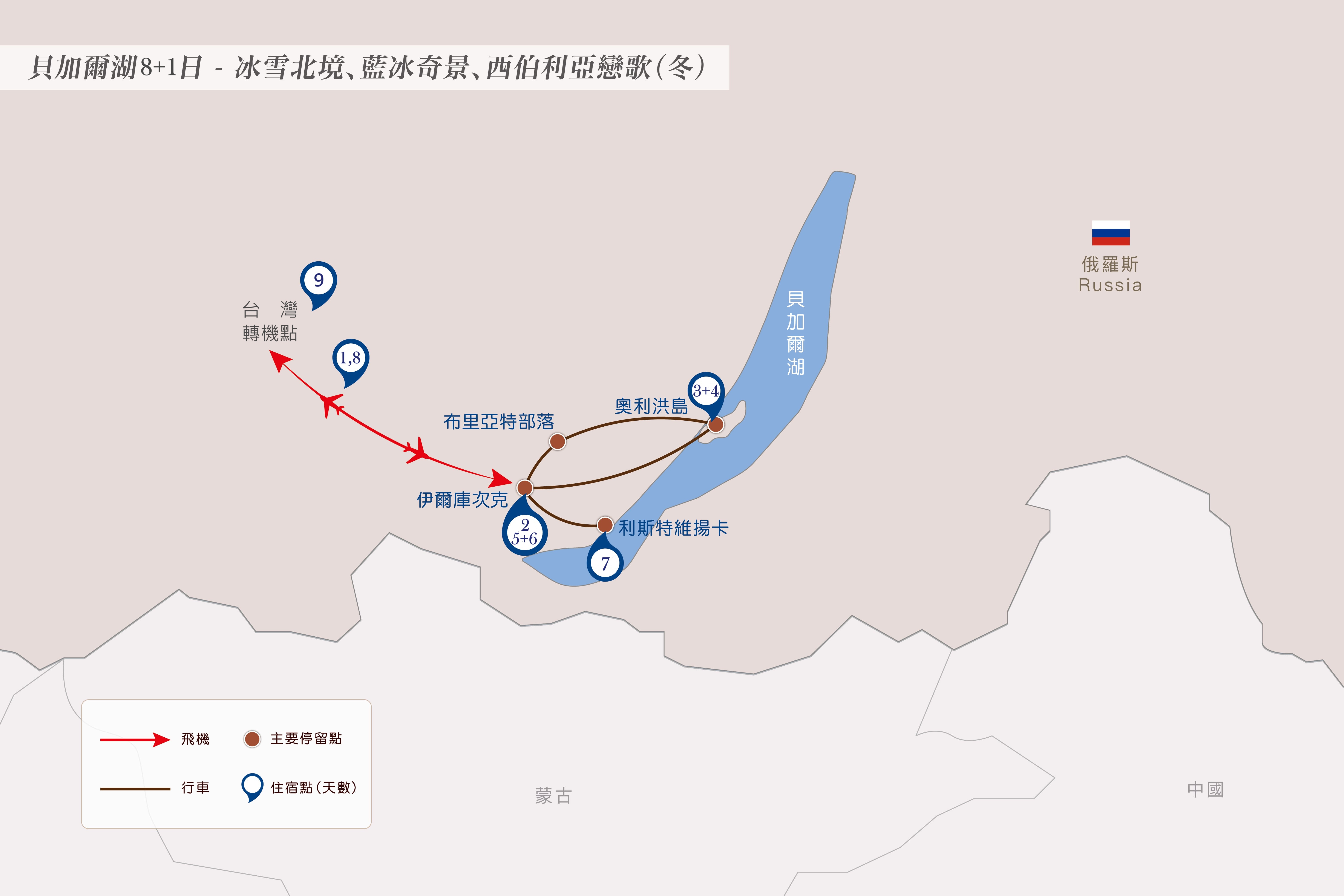 奧利洪島上住宿為傳統木屋建築,且道路大多未開化,為適應崎嶇的地形,交通以俄式吉普車為主,這是在島上移動最方便的交通工具,只是小木屋式的住宿及吉普車內空間有限,請您準備二日過夜包前往奧利洪島,方便舒適的享受貝加爾湖美景!