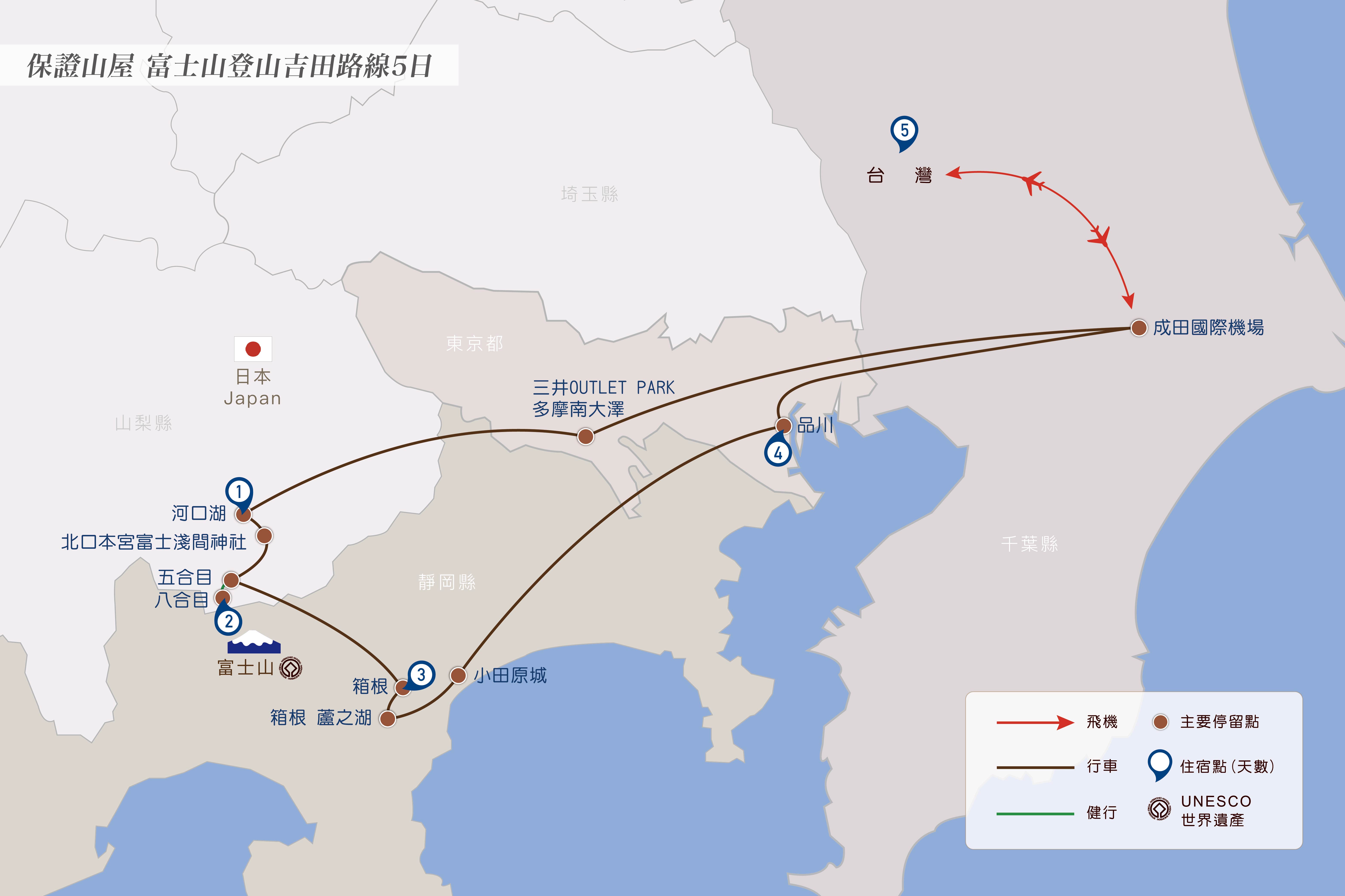 首先前往北口本宮富士淺間神社,虔誠祈求接下來的登山行程順利平安。於吉田登山入口的五合目享用午餐後,由嚮導解說登山各項注意事項及暖身後即開始本次的富士山之旅。吉田路縣是富士山最受歡迎的登山路線,沿路也有較多的山小屋及休憩設施。