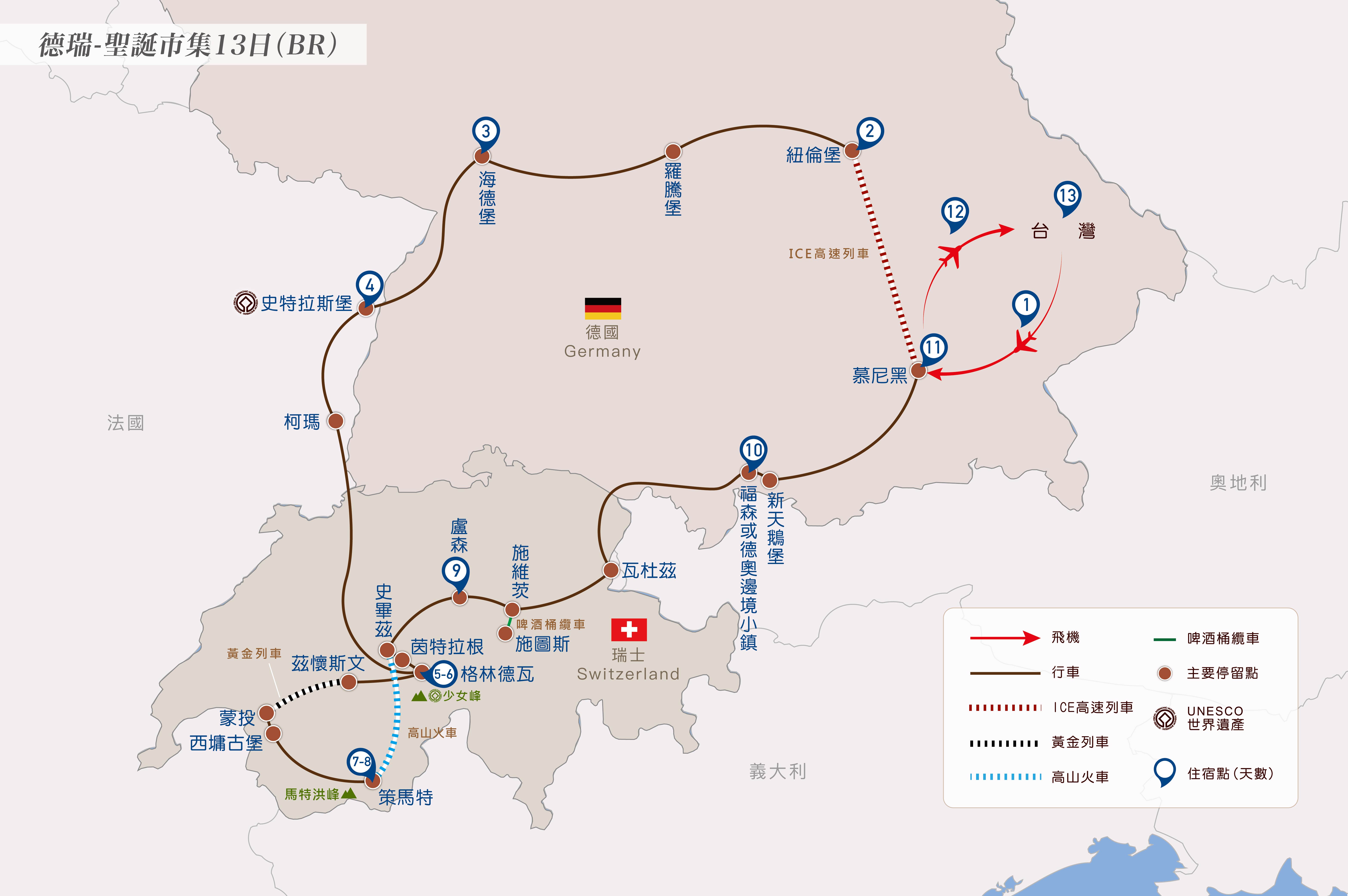 早餐:機上 午餐:慕尼黑風味料理 晚餐:漫遊聖誕市集,本餐敬請自理