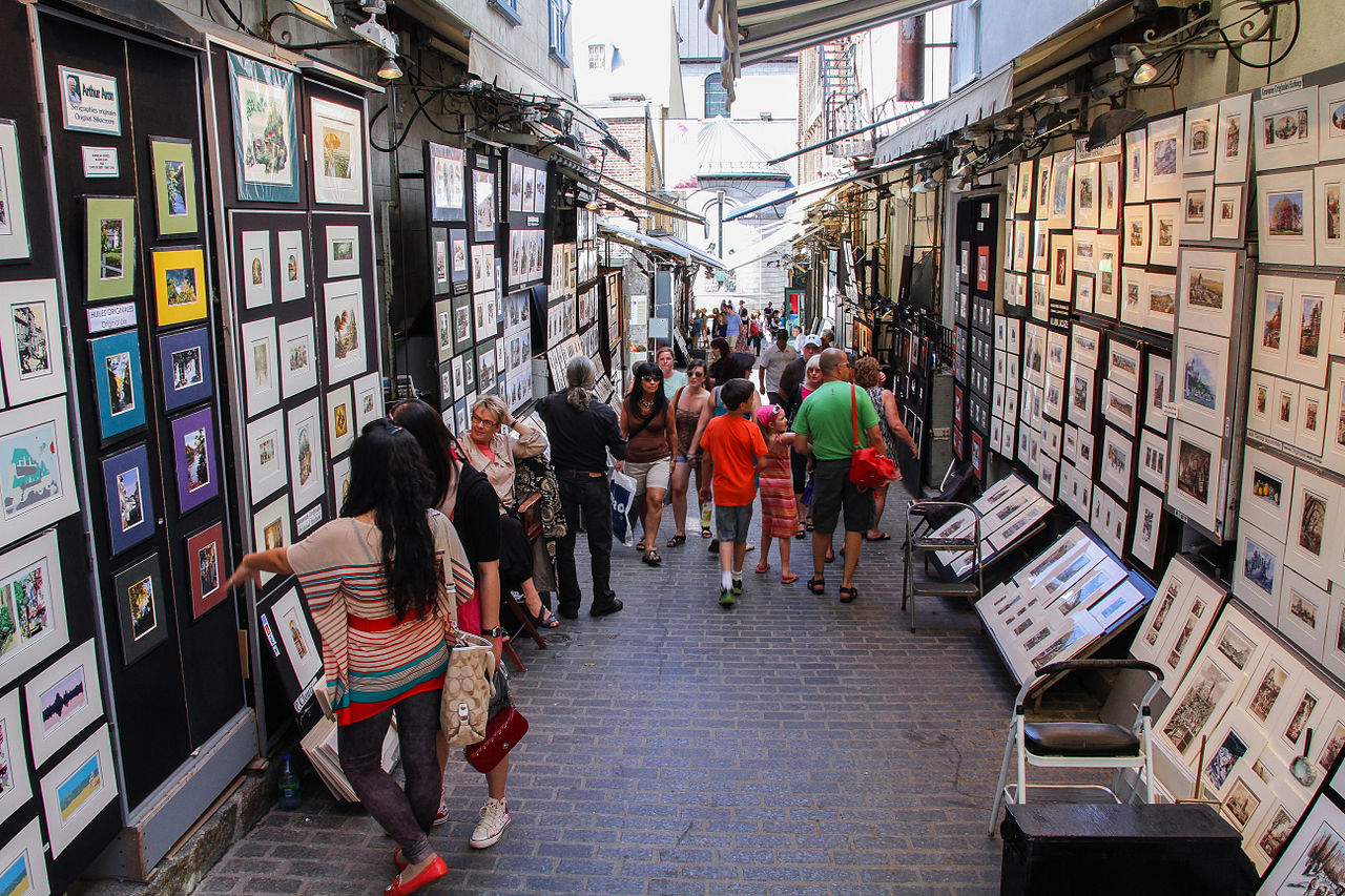 在芳堤娜城堡對面的一條小巷內,聚集了大約20個左右風格各異的畫攤,以及絡繹不絕前來觀畫或買畫的遊客。大部分的畫作描繪著魁北克四季景色,也有各種角度的芳堤娜城堡畫作。畫家們把作品整齊地展掛起來,等待著有緣人上門。