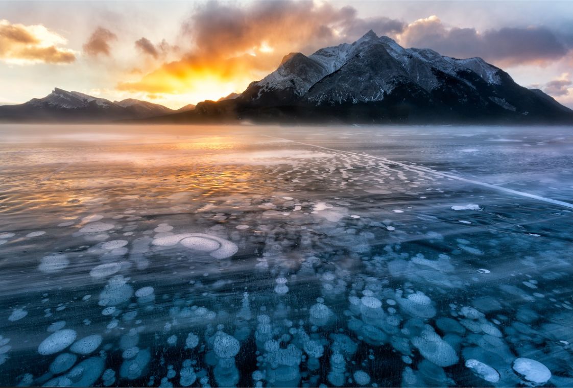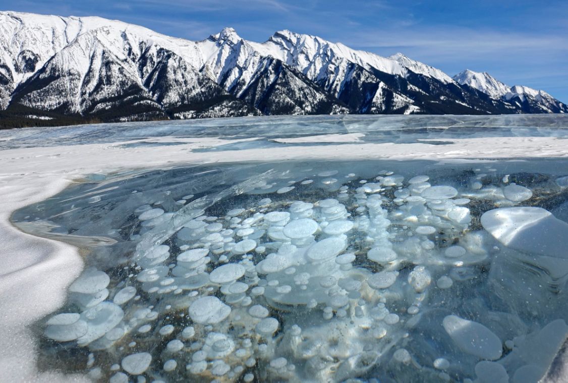 亞伯達省內最大的人工湖,又被稱為氣泡湖,因為湖底的植物會釋放出甲烷氣體,當冬季湖水開始結冰時,氣泡就會被困在冰層下面並不斷堆疊,形成獨特的「凍結氣泡」,層層堆疊形成了冬季限定的美麗模樣。 (註:若因天氣因素無法參觀,則以露易湖滑雪場替代)