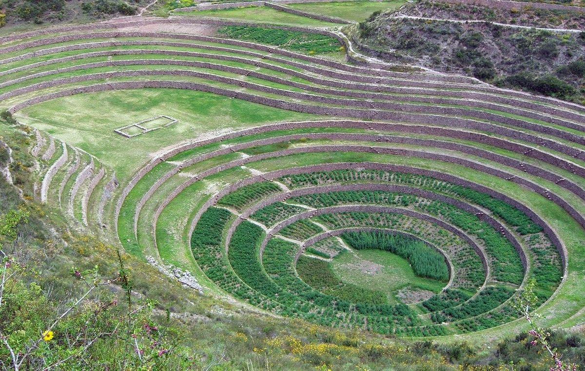 一圈一圈的圓形梯田,經常令人誤會來到外星人基地,實際上是印加帝國的實驗農場,目的用來模擬不同氣候的各種蔬果。譬如梯田越低,溫度越高;梯田越高,溫度越低。印加人藉此了解到哪些蔬果適合種植在高海拔,譬如玉米。由此可知印加人在農業種植的實驗精神與智慧是令人佩服的。