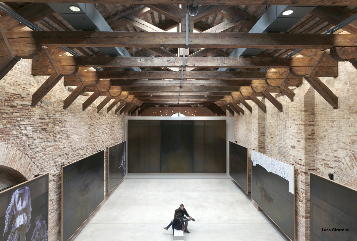 建築外殼:這座建築原建於 17 世紀,是當時威尼斯海關檢查船隻貨物的地方。它保留了原本粗獷的紅磚牆、巨大的木頭橫樑和三角形的倉庫結構。